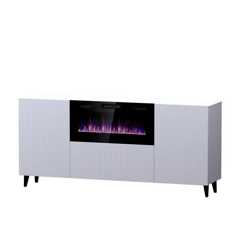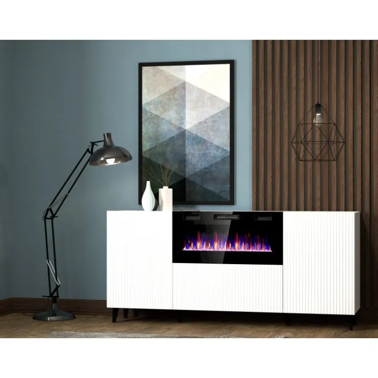 PAFOS kommode EF 180 hvid/hvid er en elegant og funktionel løsning til dit hjem. Denne kommode tilbyder muligheden for at installere en pejs, som kan bestilles separat (CAMA-KOMINEK). Med dimensionerne højde: 82 cm, bredde: 180,5 cm, og dybde: 40 cm passer den perfekt i ethvert rum. Kroppen er lavet af 16 mm lamineret mat spånplade, mens frontene er lavet af 16 mm lamineret MDF-plade beklædt med folie og synlige udskæringer. Kanten er lavet af ABS, og benene er af plastmateriale. Der er ingen håndtag, da frontene rækker ud over toppen, hvilket giver et stilrent og moderne look.