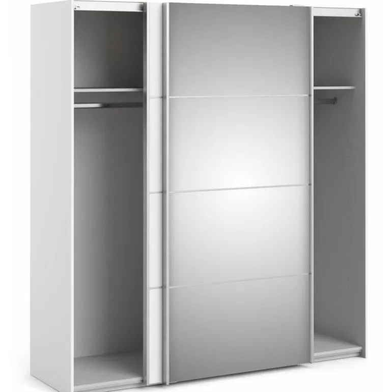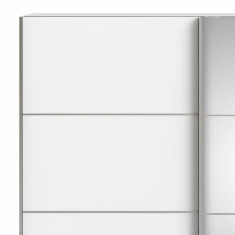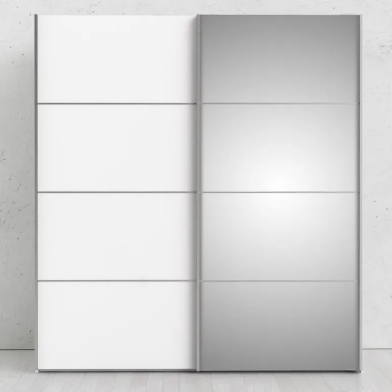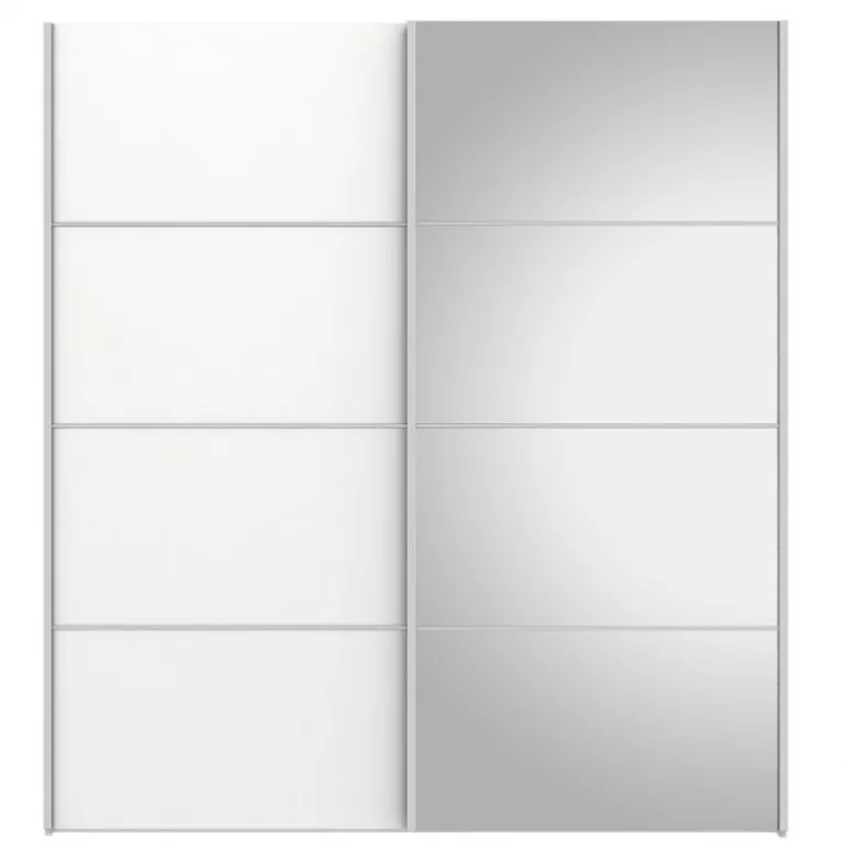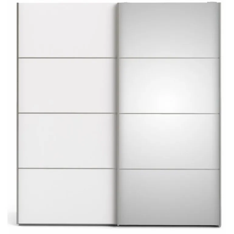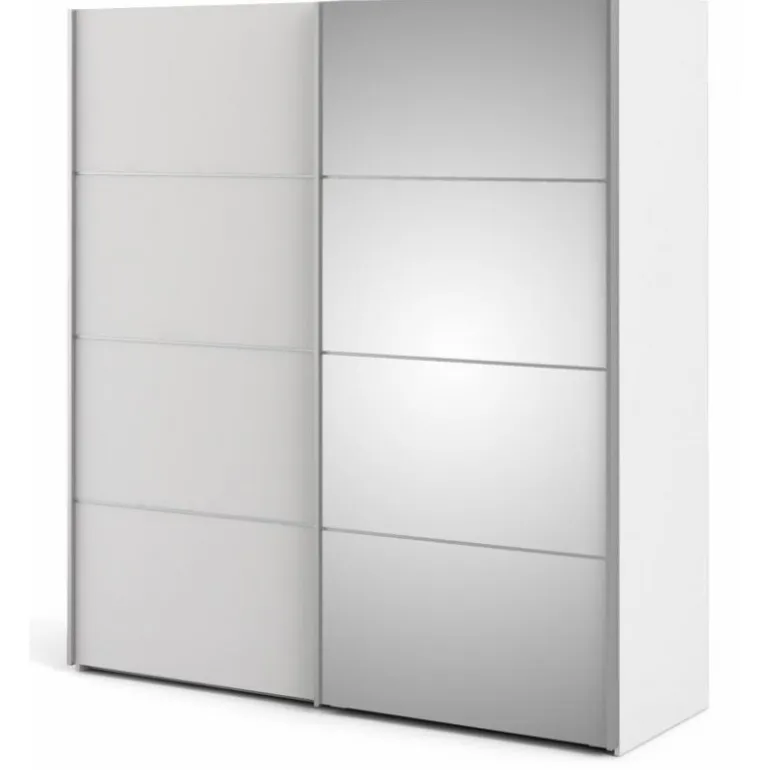 Stilrent klædeskab i flot design med 2 skydelåger, heraf 1 med glas front. Skabet rummer 2 bøjlestænger og 2 fastmonterede hylder. En funktionel og moderne løsning, der pynter i ethvert soveværelse.