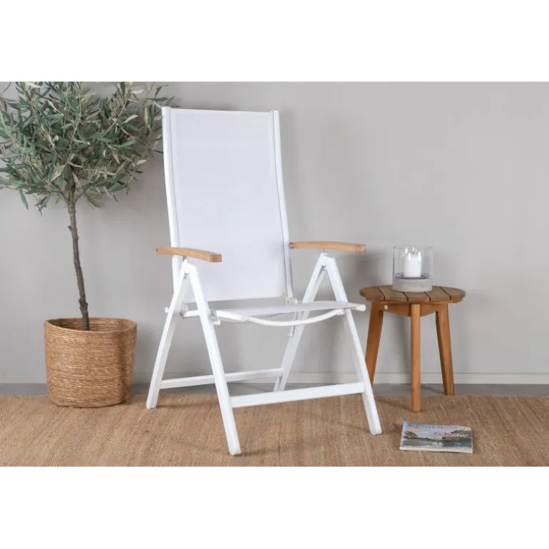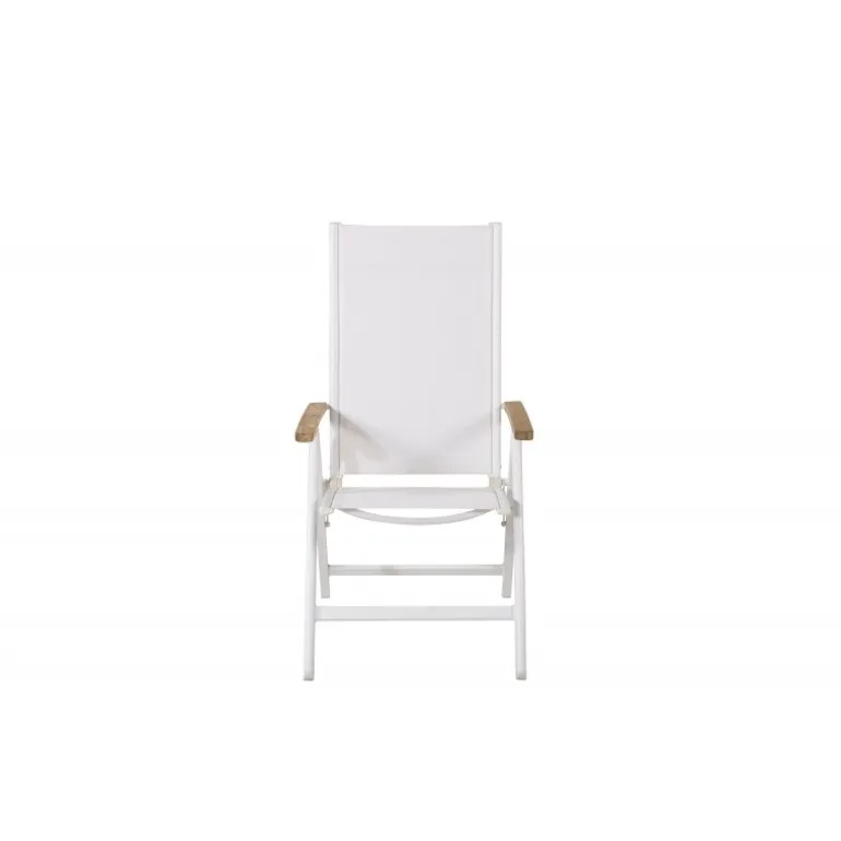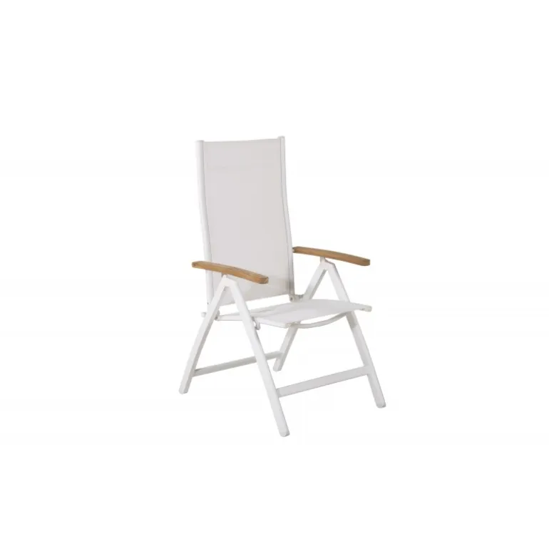 Skab en moderne glans på terrassen med en stol fra Panama-serien. En lækker, hvid, sammenklappelig spisestol tilpasset til udendørs brug. Med smagfulde armlæn i teak får stolen et pompøst udtryk, der passer til mange smag. Stolen fungerer lige så godt til moderne som klassiske spiseborde. Nyd mange vidunderlige sommerdage sammen! Plejeråd: Textilene er et syntetisk stof lavet af PVC-behandlet polyester. Materialet er vandafvisende og UV-behandlet for at modvirke solens blegning. Rengøring bør ske ca. en gang om måneden, brug en fugtig klud og tør af.