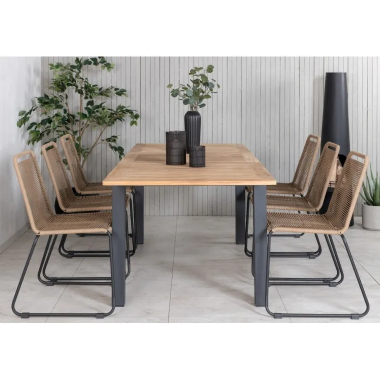 Her får både familie og venner en plads! Vores udtrækkelige og lækre træbord Panama kombineres med lattefarvede spisestole fra Lindos-serien. Indret udendørsområdet med en moderne og stilfuld Loungesæt – Havemøbelsæt i jordnære farver! Panama Rektangulær Loungesæt – Havemøbelsæt er det perfekte valg til hyggelige sammenkomster i haven eller på terrassen. Med materialer som teak og polyesterreb sikrer dette sæt både holdbarhed og æstetik.