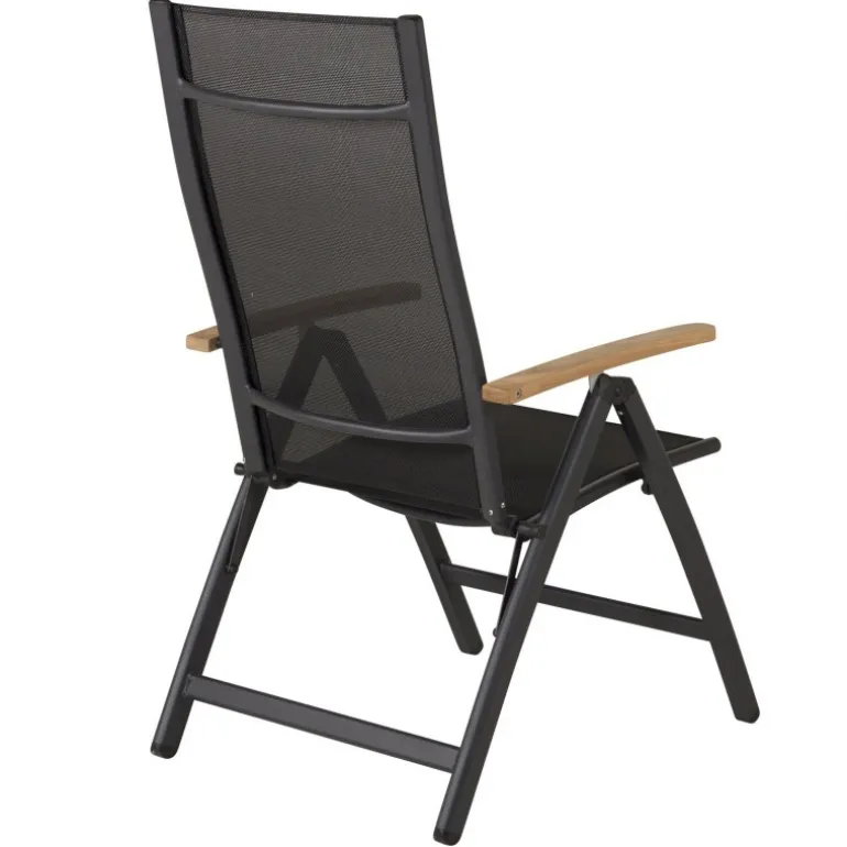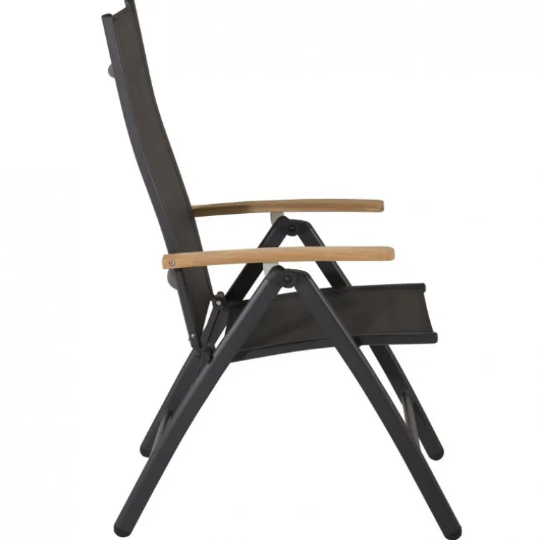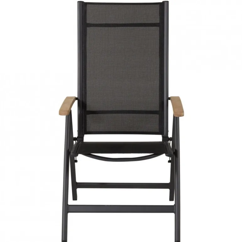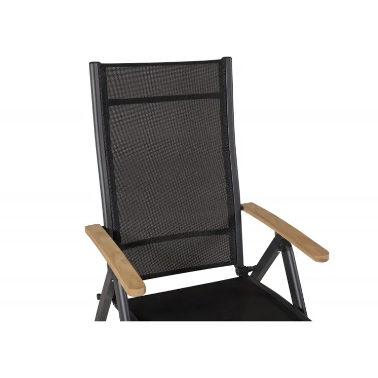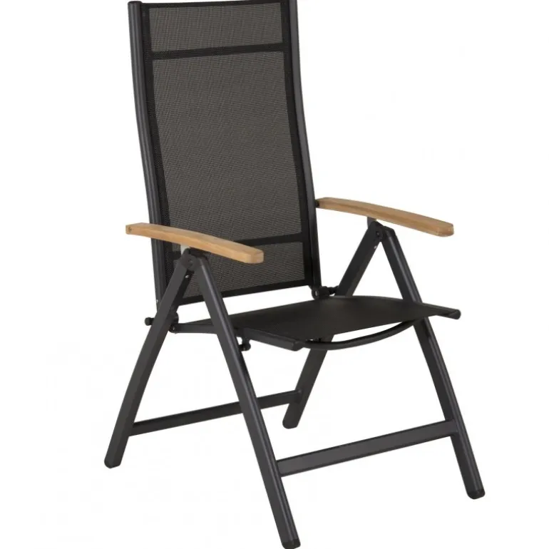 Panama, en sort sammenklappelig spisebordsstol tilpasset udendørs brug. Med smagfulde armlæn i teak får stolen et pompøst udtryk, der passer til mange smagsretninger. Stolen fungerer lige så godt til moderne som klassiske spiseborde. Juster ryglænet for optimal komfort og nyd mange dejlige sommerdage sammen! Plejeråd: Textilene er et syntetisk stof lavet af PVC-behandlet polyester. Materialet er vandafvisende og UV-behandlet for at modvirke solens blegning. Rengøring bør foretages cirka en gang om måneden; brug en fugtig klud og tør af.