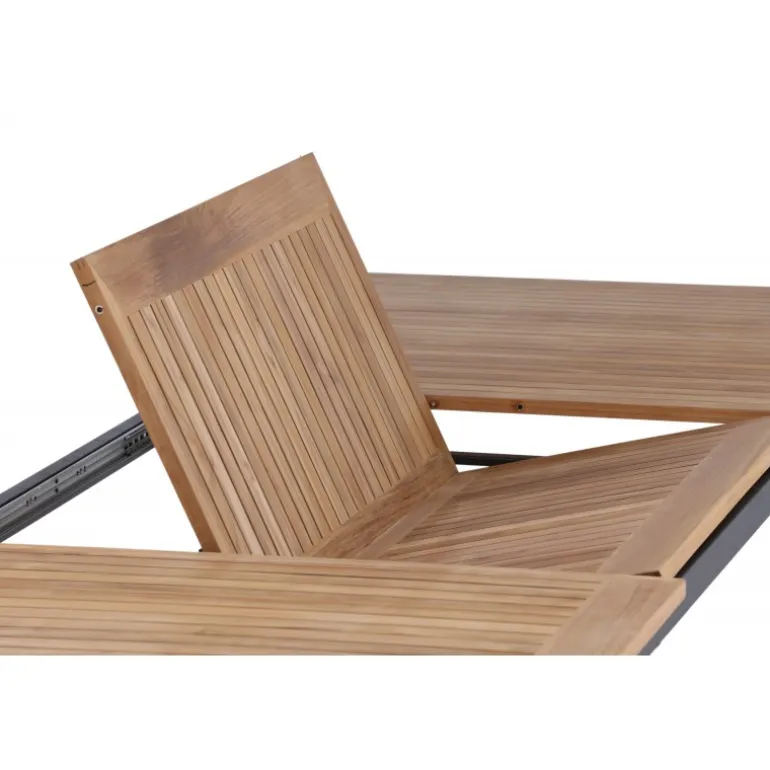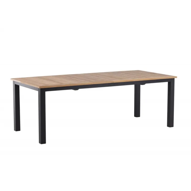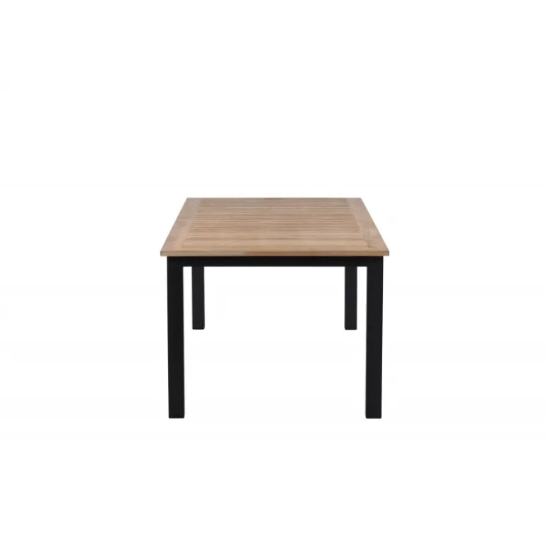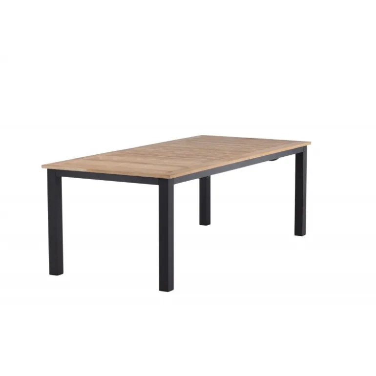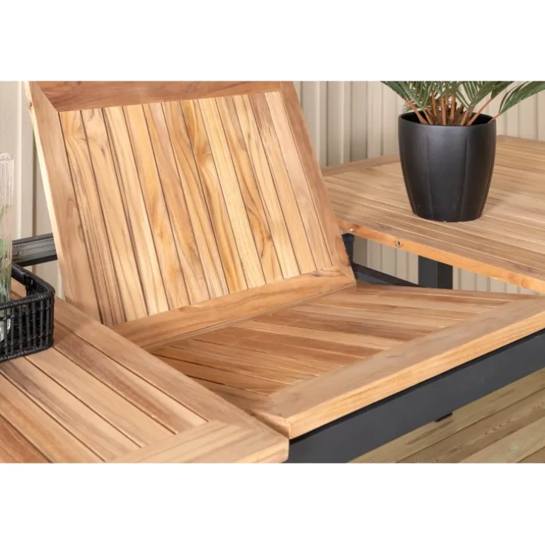 Panama, vores udtrækkelige spisebord i en rektangulær form, er perfekt til både små og store sammenkomster! Bordpladen er lavet af teak og understellet i sort metal – en lækker farvekombination, der holder gennem tiden. Saml familie og venner til dejlige middage i sommersolen og gør dig klar til nattelivet! Plejeråd: Vores teakmøbler er fremstillet af certificeret teak, der er dyrket til formålet og ikke ødelægger sarte regnskove. Som en af de mest holdbare træsorter indeholder teak meget olie, som normalt er nødvendigt, så materialet ikke revner. Fordi denne trætype naturligt indeholder meget olie, behøver møblerne ikke blive imprægneret så ofte.