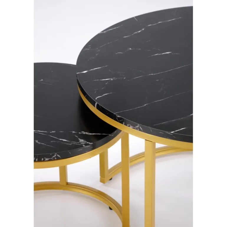 Opgrader din stue med PAOLA sæt med 2 sofaborde, der kombinerer elegant design og funktionalitet. Disse borde er lavet af høj kvalitet lamineret MDF og pulverlakeret stål, hvilket sikrer holdbarhed og stil. Med deres Sorte marmor og gyldne farvekombination tilføjer de et luksuriøst touch til enhver indretning. De forskellige størrelser på bordene (60/40 cm og 38/34 cm) gør dem alsidige og perfekte til både store og små rum.