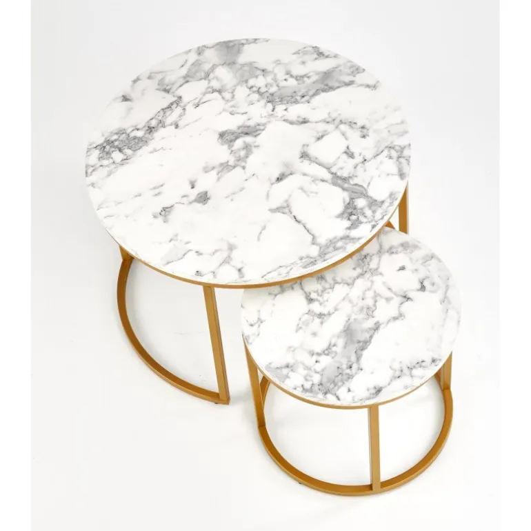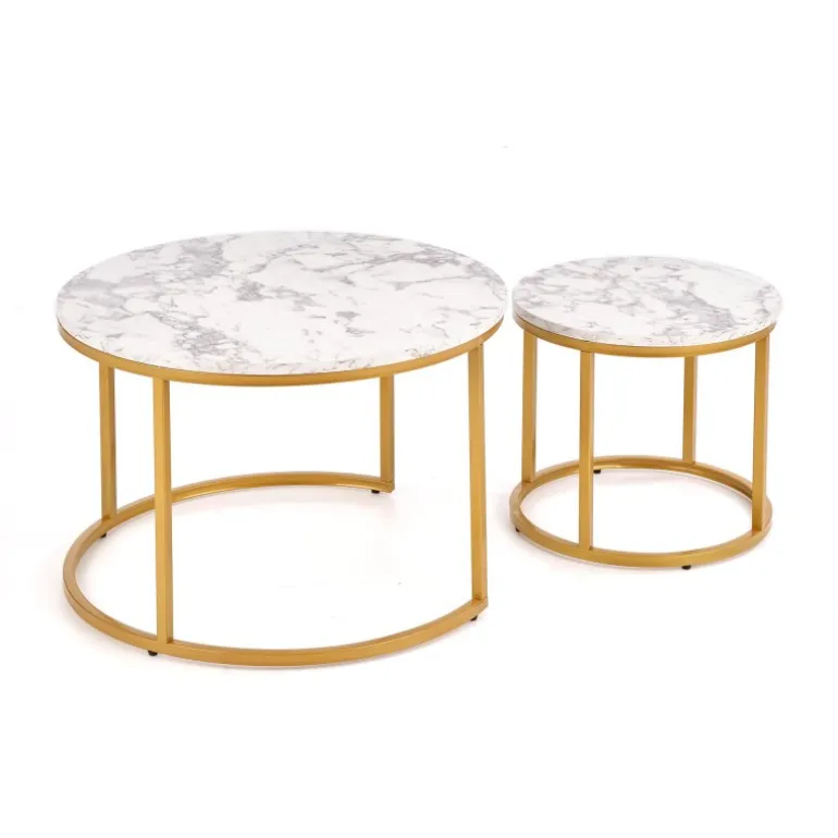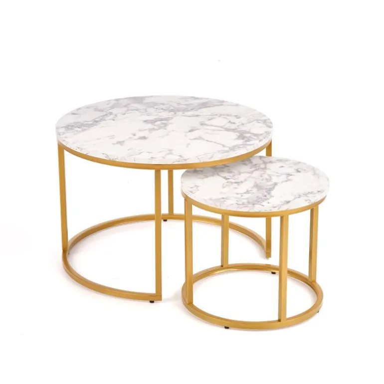 PAOLA sæt af 2 sofaborde kombinerer stil og funktionalitet for at forbedre din stue. Med dimensioner på 60/40 cm og 38/34 cm er disse borde ideelle til både små og store rum. Fremstillet af lamineret MDF og pulverlakeret stål, sikrer de holdbarhed og elegance. Den sofistikerede marmor/guld farvekombination tilføjer et luksuriøst touch til enhver indretning. Tilføj en moderne og praktisk løsning til dit hjem med PAOLA sofaborde.