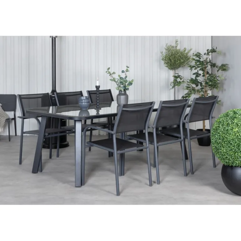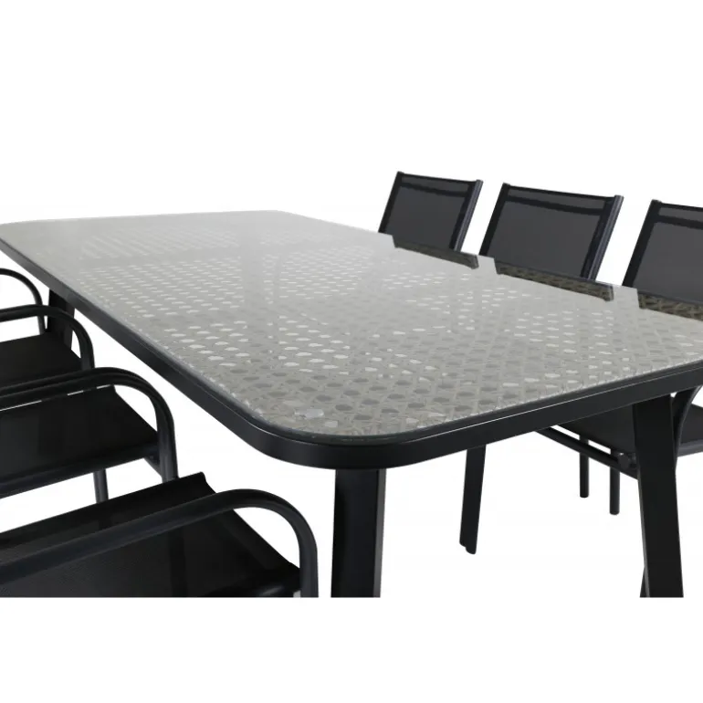 Spisebordet Paola i et slankt design, sammen med spisebordsstolene Santorini – den perfekte kombination for dem, der ønsker en trendy Loungesæt – Havemøbelsæt. De høje siddekomfort i stolene inviterer til lange og vidunderlige øjeblikke af socialt samvær!