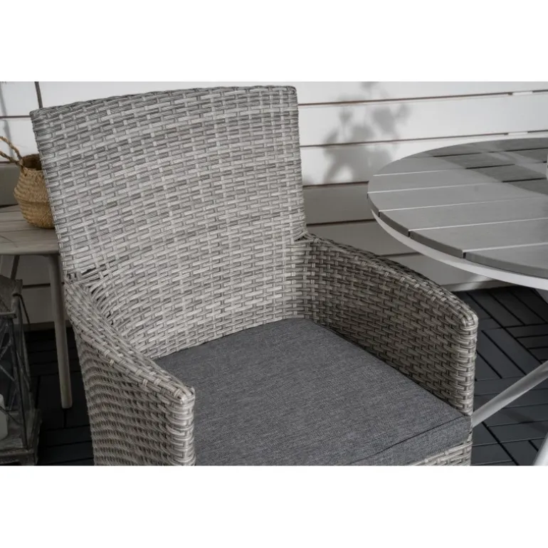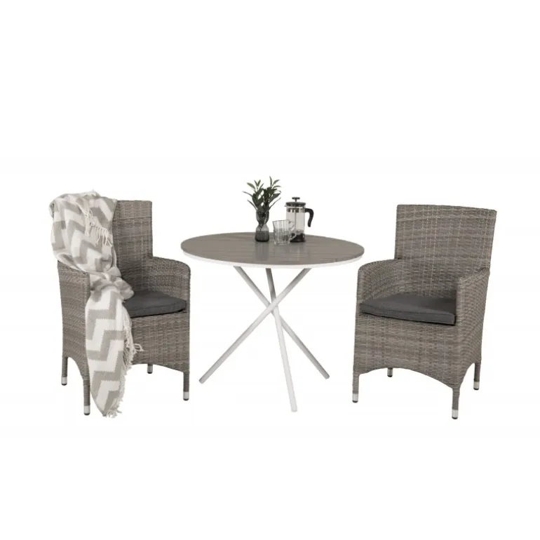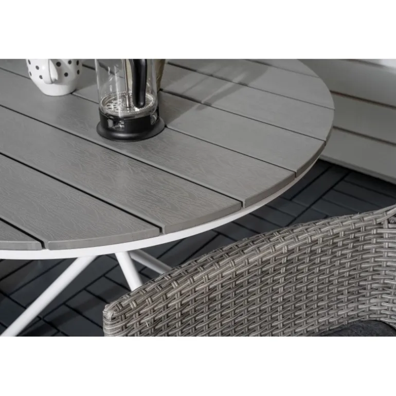 Forkæl dig selv med en hyggelig eftermiddagskaffe ved dette stilfulde og komfortable Loungesæt – Havemøbelsæt! Vores elegante runde spisebord Parma er perfekt til den solrige plads på altanen. Her kombineres det med robuste og komfortable spisebordsstole fra Malin-serien. Aintwood-materialet, der anvendes i bordpladen, er både holdbart og let at vedligeholde, hvilket gør det ideelt til udendørs brug.