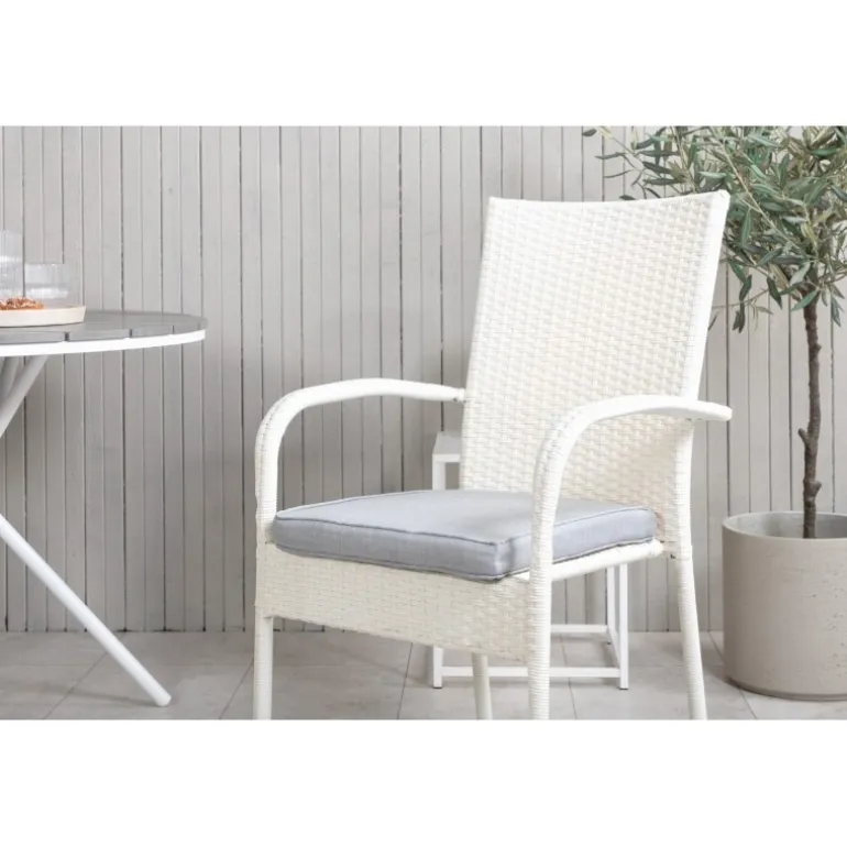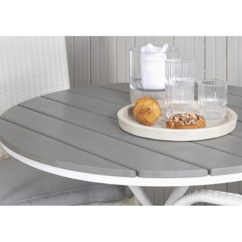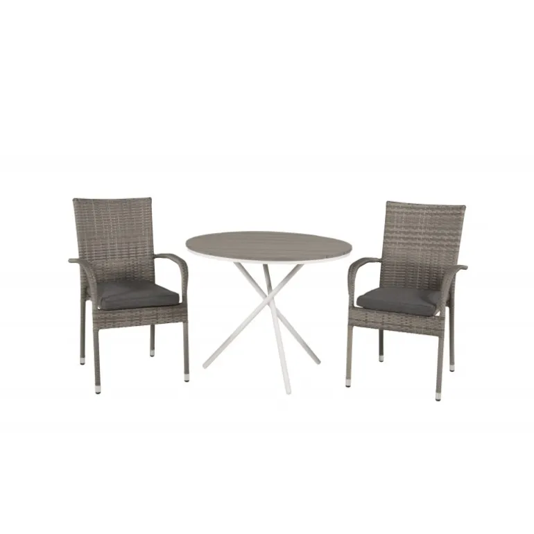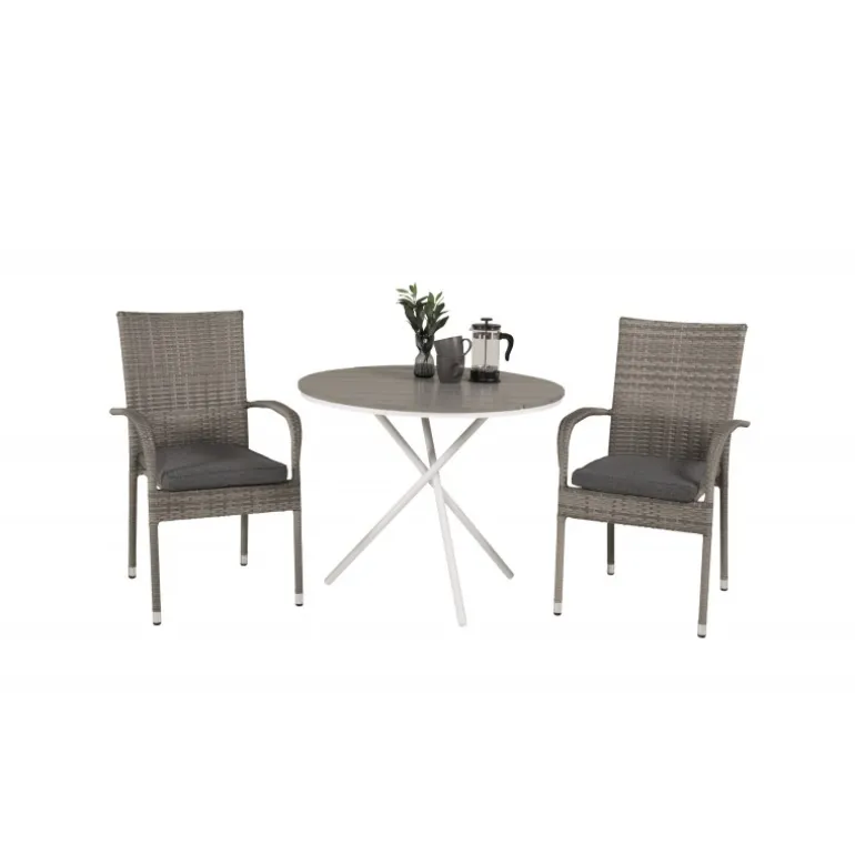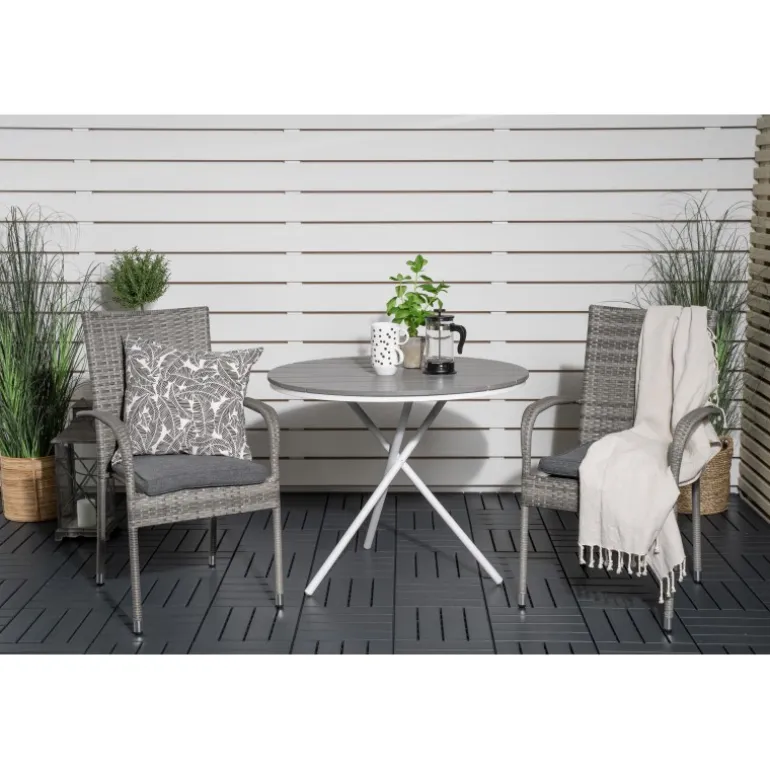 Parma Rund Loungesæt – Havemøbelsæt er den perfekte løsning til din balkon. Dette elegante sæt består af et Cafébord Parma og vores stablebare grå Anna stole. Skab den ideelle udendørs atmosfære og gør dig klar til sæsonen med stil!