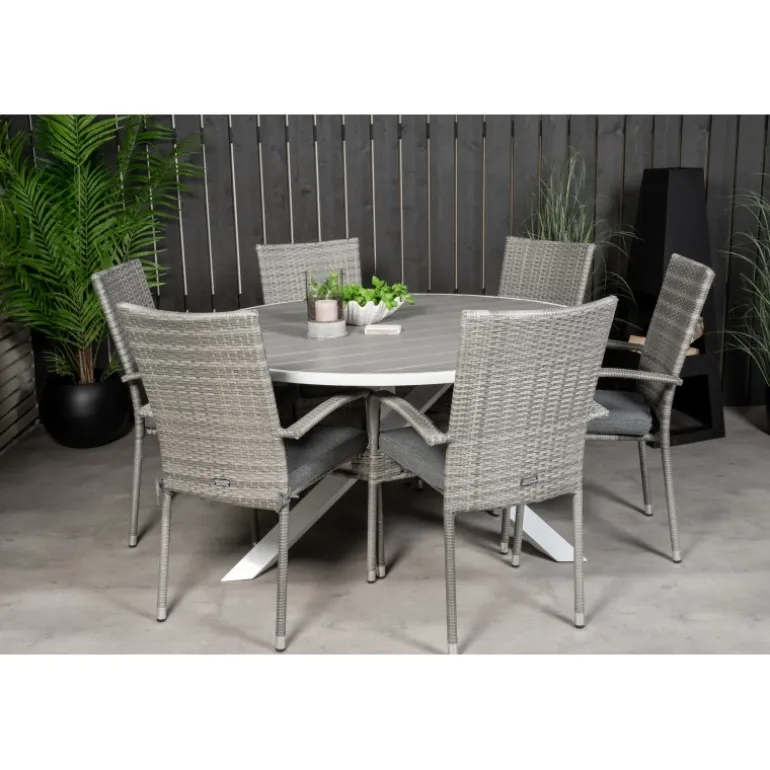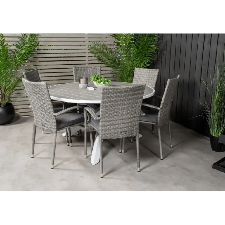 Rundt Loungesæt – Havemøbelsæt bestående af Parma spisebord og Anna stole. Her får du et Loungesæt – Havemøbelsæt i kunstig rattan, som passer ind i de fleste miljøer. Dette sæt er perfekt til udendørs brug og tilføjer et stilfuldt touch til din terrasse eller have. Bordpladen er fremstillet af aintwood, et plastmateriale, der er holdbart og nemt at vedligeholde, mens stellet er lavet af aluminium og stål, som sikrer stabilitet og lang levetid. Vær opmærksom på, at møbler i aintwood ikke bør placeres i uventilerede, glaserede områder, hvor temperaturen kan stige til høje grader, da dette kan deformere materialet.