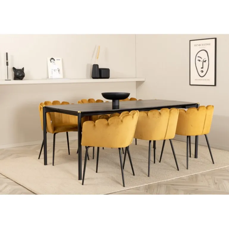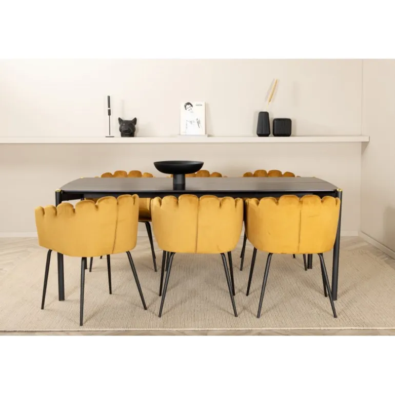 En moderne farveklat kan nemt løfte interiøret til næste niveau! Limhamn spisestol er en moderne favorit i mange husholdninger med sine bløde former og orm-formede ryg, lavet af gul velourstof og sorte stoleben i pulverlakeret metal. Stolene har et indbydende design med dekorative orm-formede ryg med dekorative sømme og et rundt sæde i gul velourstof. Stoldimensioner: Højde: 76,56 cm, sædehøjde: 48 cm, bredde: 61 cm, dybde: 54 cm. Her matches de 6 stole med et stilfuldt spisebord fra Pelle-serien. Bordpladen er i sort MDF med finer og bordbenene er i sort jern med en dekorativ messingknap på toppen. Borddimensioner: Længde: 190 cm, bredde: 90 cm, højde: 75 cm.