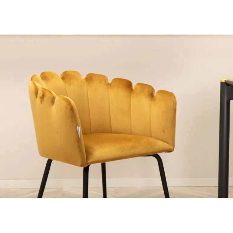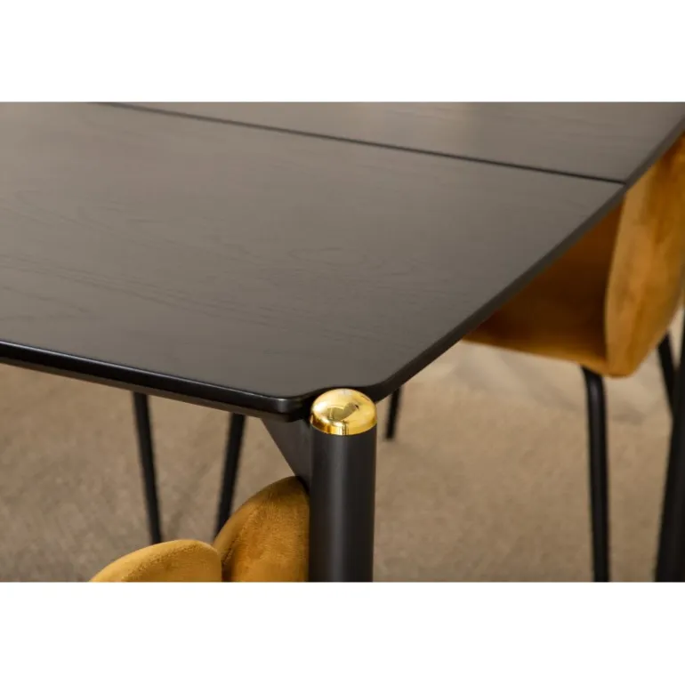 - Høj Kvalitet: Stole i gul velourstof og bord i sort MDF med finer.