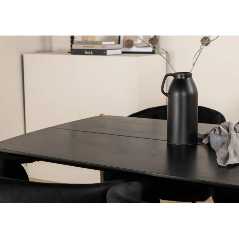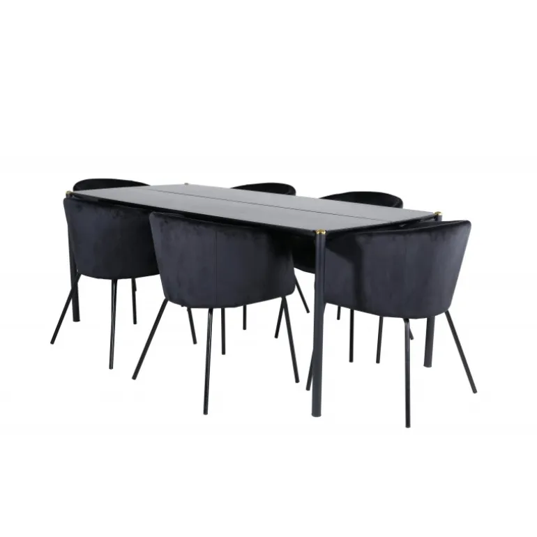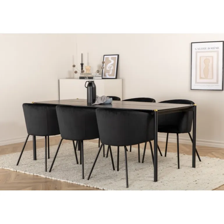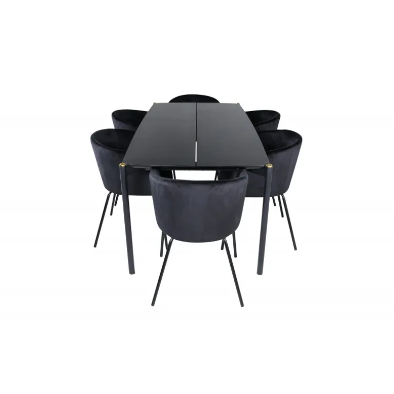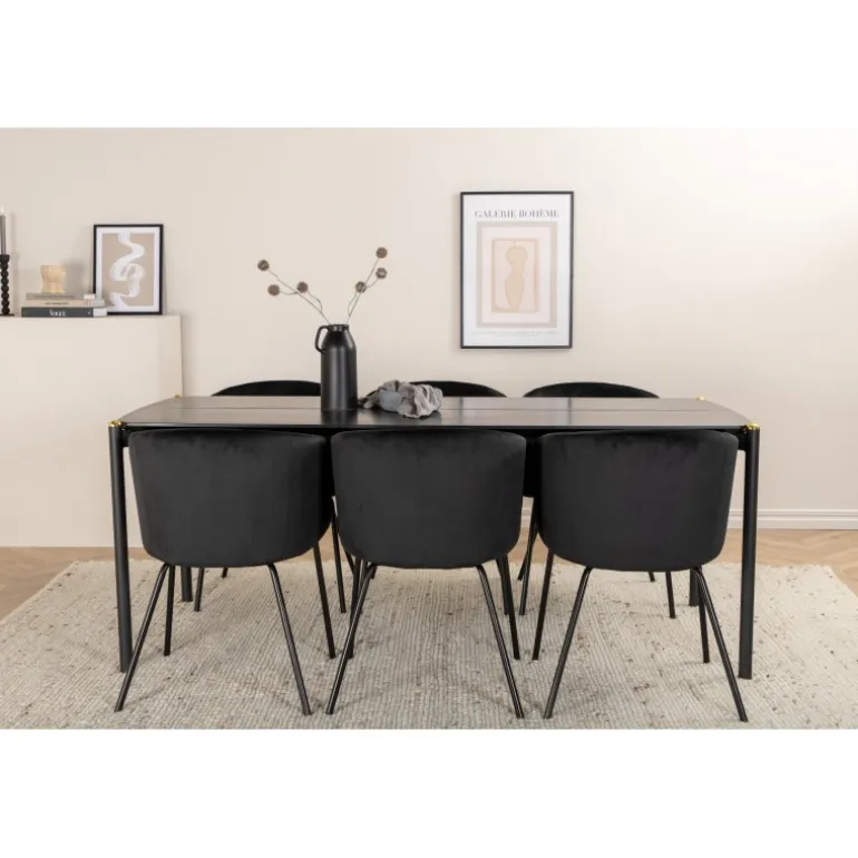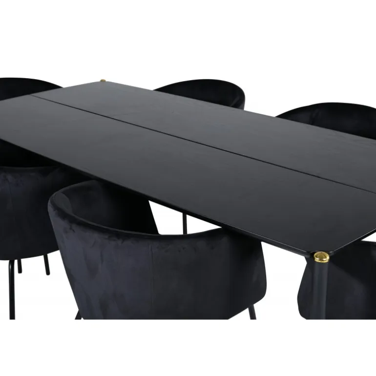 Pompøst og elegant – et spisebordssæt, der imponerer! Spisebordet Pelle har et velovervejet design med lige, nordiske former, der giver et stilfuldt udtryk. Smalle ben i jern med en dekorativ messingknop på toppen og en rille i midten af bordpladen, der bliver en lækker detalje. Bordpladen er i sort MDF med finer og bordets dimensioner er: længde: 190 cm, bredde: 90 cm, højde: 75 cm. Matchet med 6 af vores populære Berit spisebordsstole. Stolene har et luksuriøst design med en komfortabel sæde i sort fløjl og stilfuldt smalle stoleben i sort jern. Stolens dimensioner: højde: 78 cm, sædehøjde: 49 cm, bredde: 55 cm, dybde: 55 cm.