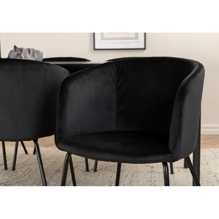 - Komfortable stole: Sorte fløjlsæder med smalle jernben.