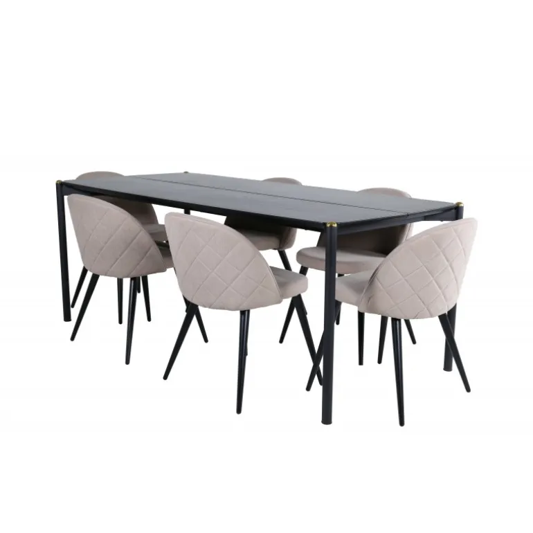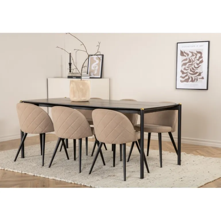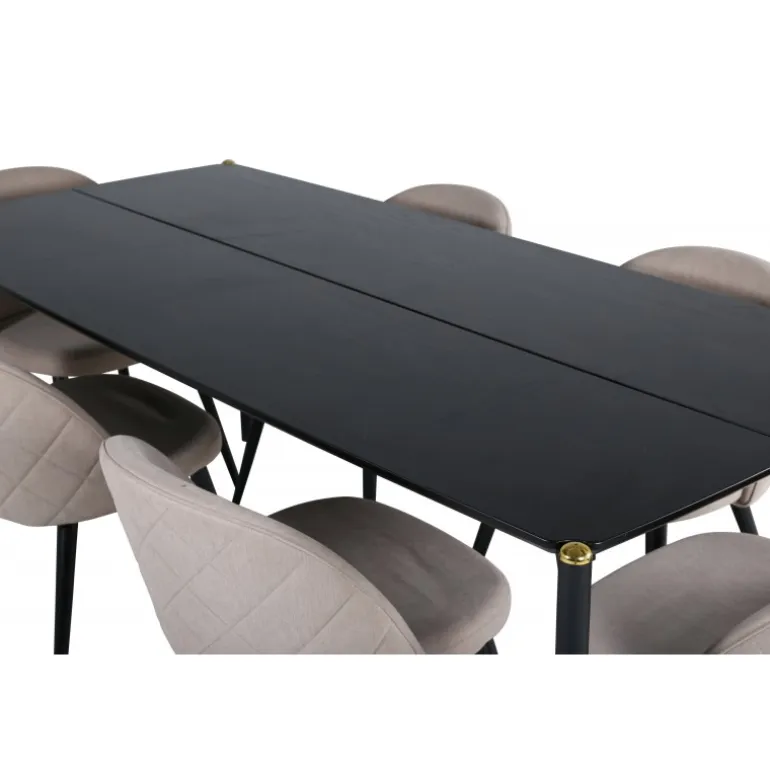 Stilfuldt, luksuriøst og tidløst – Spisebordssættet Pelle skaber et modebevidst indtryk i dit hjem! Designet er velovervejet med lige nordiske former, der giver en elegant følelse, smalle ben i jern med en dekorativ messingknop på toppen og en rille i midten af bordpladen, som bliver en lækker detalje. Bordpladen er i sort MDF med finer, og bordets dimensioner er: længde: 190 cm, bredde: 90 cm, højde: 75 cm. Her i en lækker kombination med 6 Velvet Stitches spisebordsstole. Stolebenene er let udvidede i sort jern, og sædet er beige i blødt polyester linned med dekorative syninger på stolens ryg. Stolens dimensioner: højde: 76,5 cm, sædehøjde: 46,5 cm, bredde: 50 cm, dybde: 57 cm.
