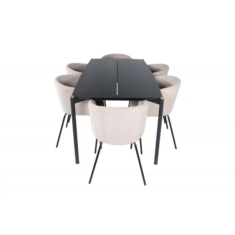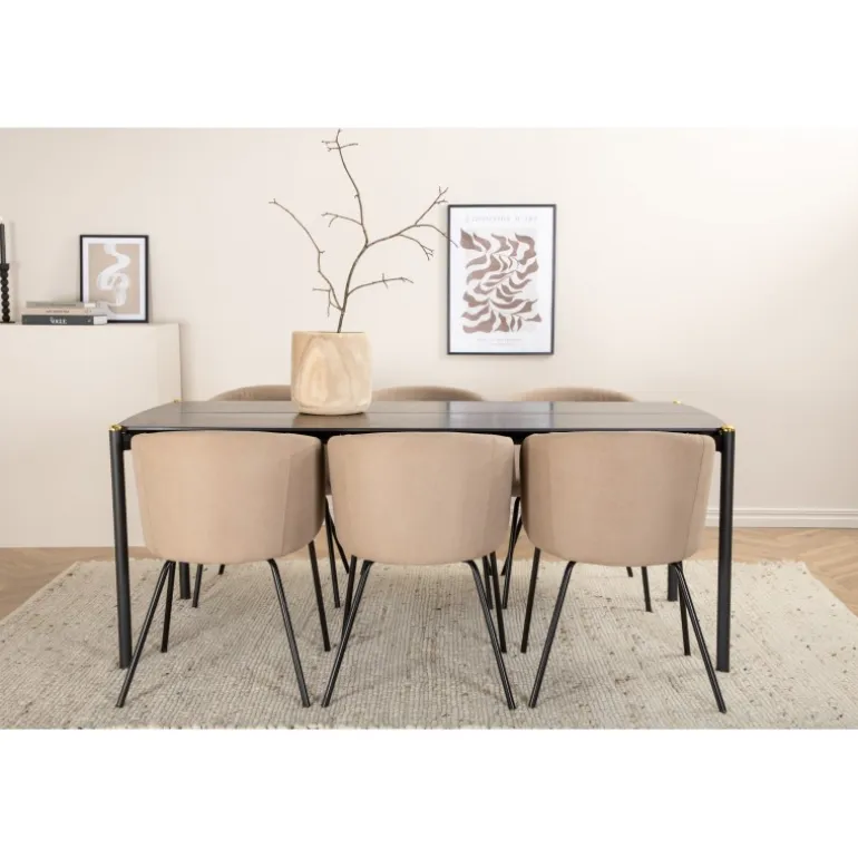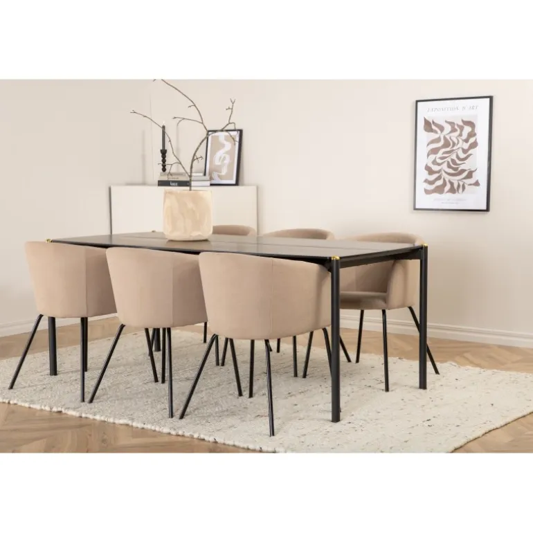 Lad dette smukke spisebordssæt med et moderne udtryk blive et naturligt samlingspunkt i dit hjem. Spisebordet Pelle har et gennemtænkt design med lige nordiske former, der giver et stilfuldt udtryk. De smalle ben i jern har en dekorativ messingknop på toppen og en rille i midten af bordpladen, som bliver en lækker detalje. Bordpladen er i sort MDF med finer, og bordets mål er: længde: 190cm, bredde: 90cm, højde: 75cm. Matchet her med 6 af vores populære spisebordsstole Berit. Stolene har et luksuriøst design med en komfortabel sæde i beige polyester linned og stilfuldt smalle ben i sort jern. Stolens dimensioner: Højde: 78cm, sædehøjde: 49cm, bredde: 55cm, dybde: 55cm.