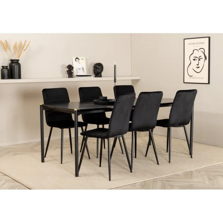 Oplev et moderne og stilfuldt Spisebordssæt med Pelle Rektangulært Spisebordssæt. Dette sæt kombinerer eksklusivitet og komfort med Windu luksus spiseborde i sort fløjl og metal, der skaber et indbydende blikfang. Stolenes dimensioner er: Højde: 94 cm, Sædehøjde: 47 cm, Bredde: 43 cm, Dybde: 49 cm. De seks stole matches perfekt med Pelle spisebordet, der har en sort MDF bordplade med finer. Bordets dimensioner er: Længde: 190 cm, Bredde: 90 cm, Højde: 75 cm. Designet er velovervejet med lige nordiske former, smalle ben i jern med dekorative messingknopper og en rille i midten af bordpladen, der giver en lækker detalje.