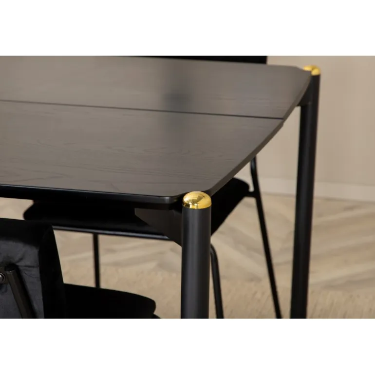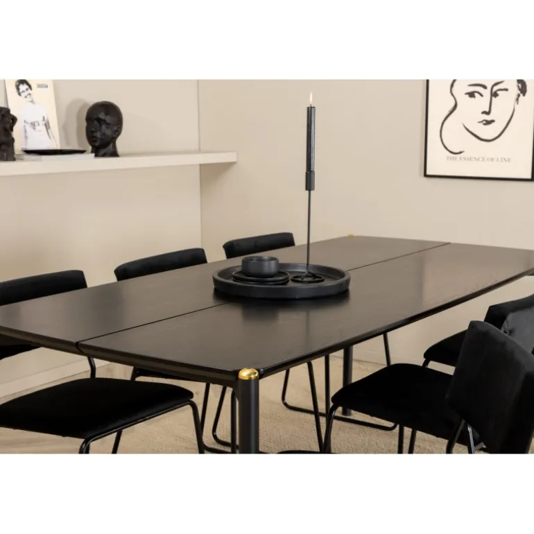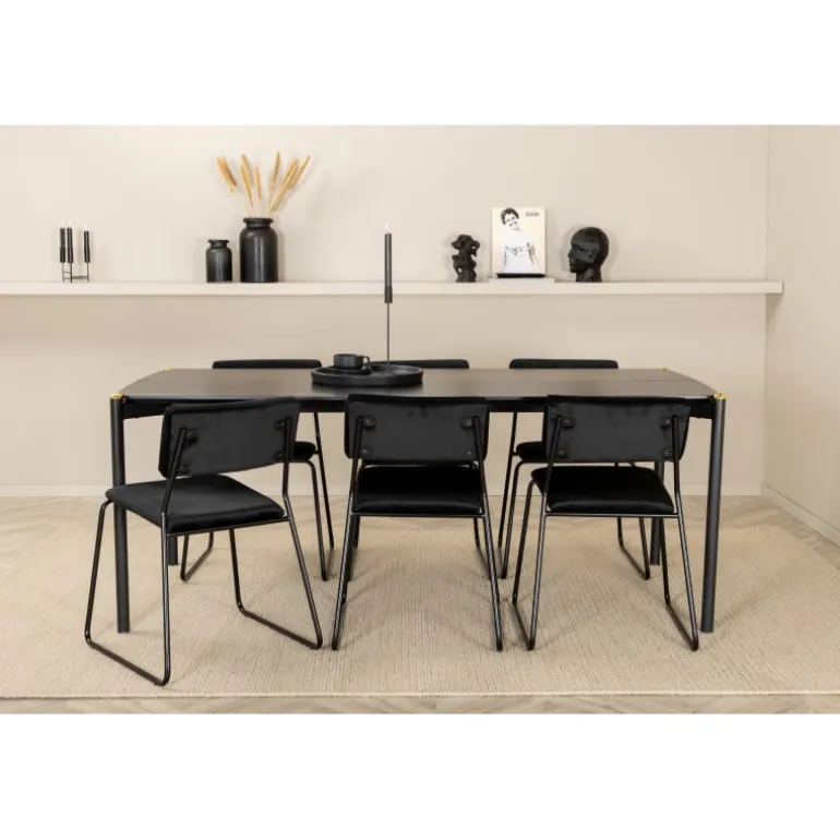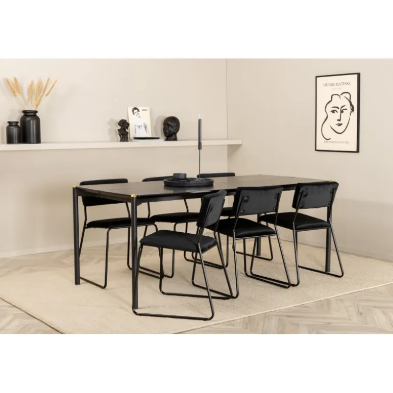 Inviterende, stilfuld og tidløs – spisebordet Pelle skaber et modebevidst indtryk i dit hjem! Designet er gennemtænkt med lige nordiske former, der giver en elegant følelse, slanke ben i jern med dekorative messingknopper på toppen og en smuk detalje i midten af bordpladen. Bordpladen er i sort MDF med finer og bordets dimensioner er: længde: 190 cm, bredde: 90 cm, højde: 75 cm. Matcher her med 6 Kenth spisebordsstole i sort farve med jernben og sæder af blødt velourstof. Stole Dimensioner: Højde: 76 cm, sædehøjde: 48,5 cm, bredde: 40 cm, dybde: 52 cm.