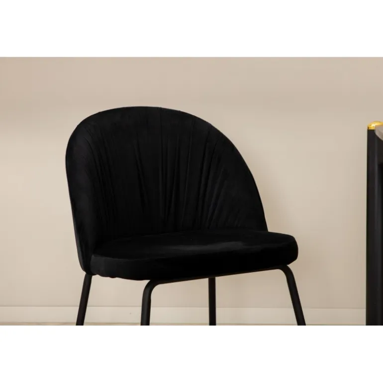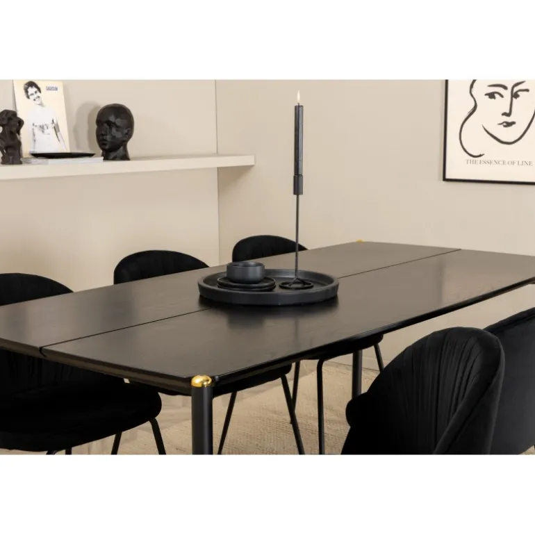 Et moderne Spisebordssæt med et eksklusivt design – Pelle Rektangulært Spisebordssæt i sort fløjl og metal er den perfekte kombination af stil og komfort! Spisestol Wrinkles har et fuldt beklædt design, der skaber et indbydende blikfang. Stolens dimensioner: Højde: 79,5 cm, Sædehøjde: 49,5 cm, Bredde: 49 cm, Dybde: 50 cm. Dette sæt inkluderer 6 stole, som matcher med Pelle Spisebord. Bordpladen er i sort MDF med finer, og bordets dimensioner er: Længde: 190 cm, Bredde: 90 cm, Højde: 75 cm. Designet er gennemtænkt med lige nordiske former, smalle ben i jern med dekorativ messingknop på toppen og en lækker detalje i midten af bordpladen.