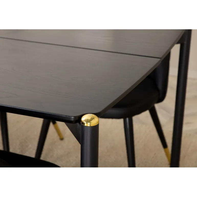 - Farve og materiale: Sort bordplade og sorte stole med messing detaljer.
