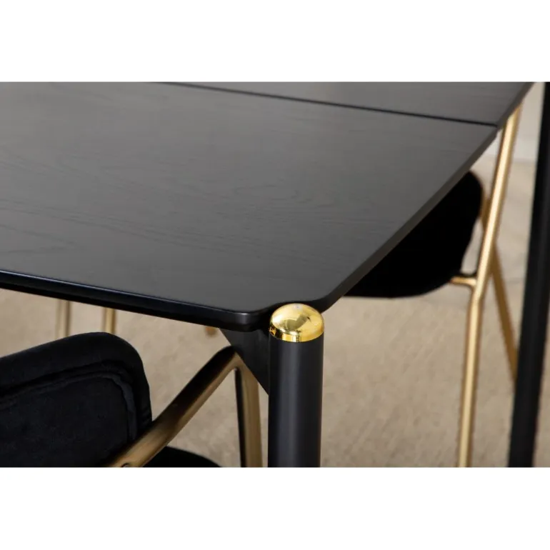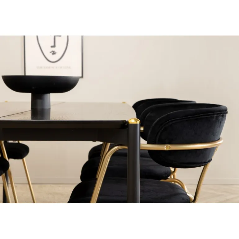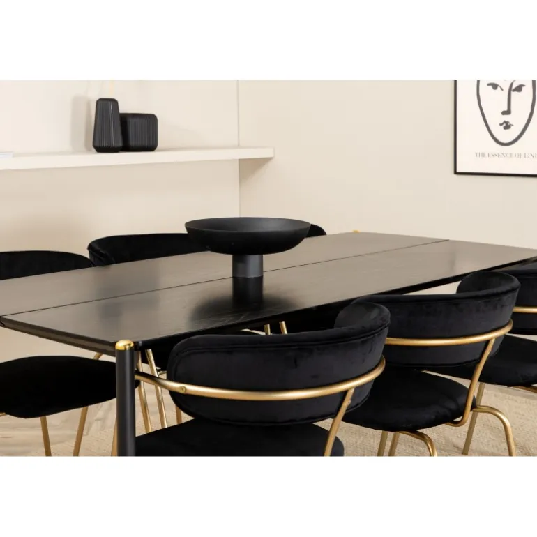 Stilfuldt, luksuriøst og tidløst – spisebordet Pelle skaber et modebevidst indtryk i dit hjem! Designet er gennemtænkt med lige nordiske former, der giver en elegant følelse, smalle ben i jern med en dekorativ messingknop på toppen og en rille midt på bordpladen, som bliver en lækker detalje. Bordpladen er i sort MDF med finér, og bordets dimensioner er: længde: 190 cm, bredde: 90 cm, højde: 75 cm. Matchet her med 6 Arrow spisebordsstole med messingfarvede metalstoleben og sorte sæder i blødt velourstof. Stolens dimensioner: Højde: 79 cm, sædehøjde: 47 cm, bredde: 58 cm, dybde: 61 cm.