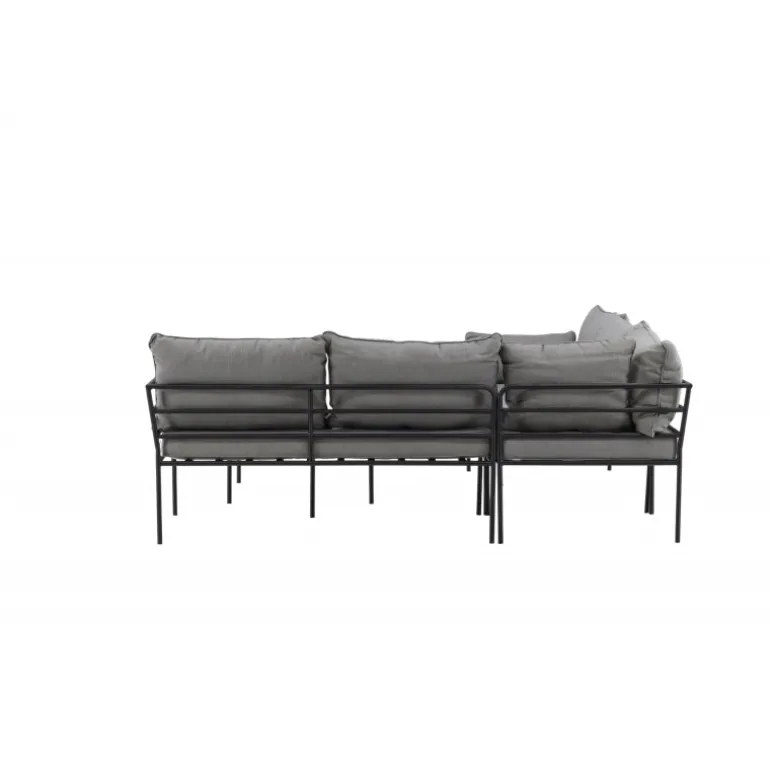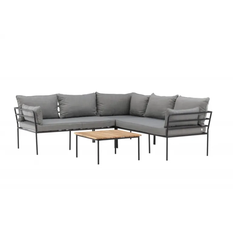 Den stilfulde og smukke Penh hjørnesofa sæt er perfekt til terrassen. Sofaen består af en hjørnesofa med fire sæder og en hjørneplads samt et elegant sofabord. Lavet af sort pulverlakeret metal med bløde, lysegrå puder. Sofabordet har tynde sorte ben, der skaber et elegant indtryk, og en bordplade i akacietræ med afrundede hjørner.