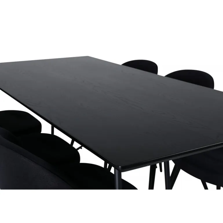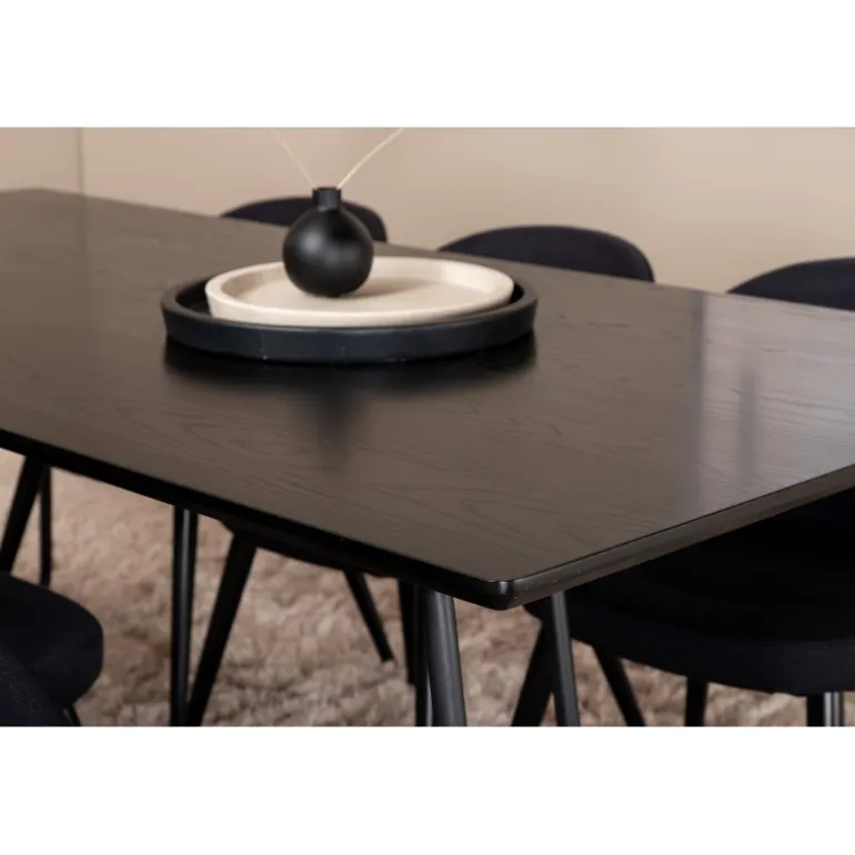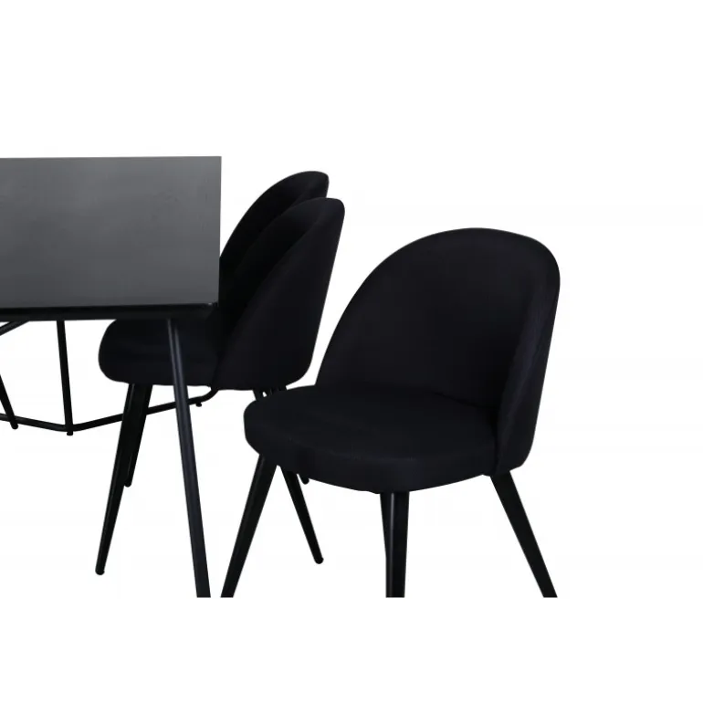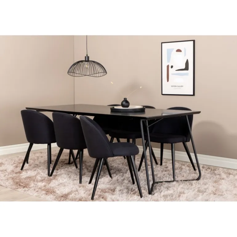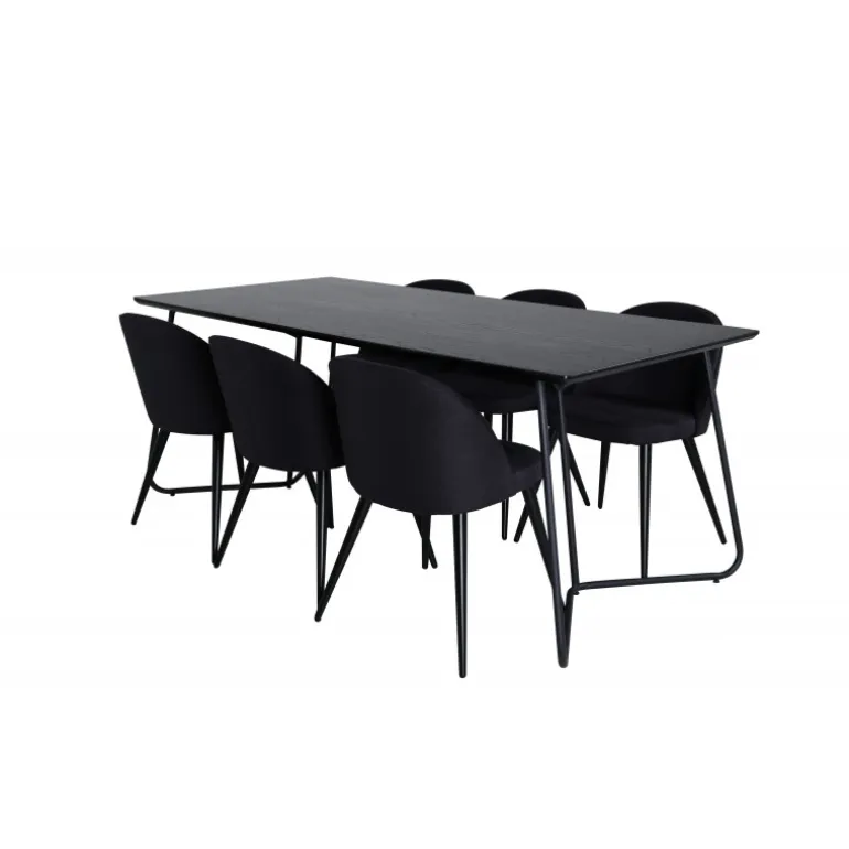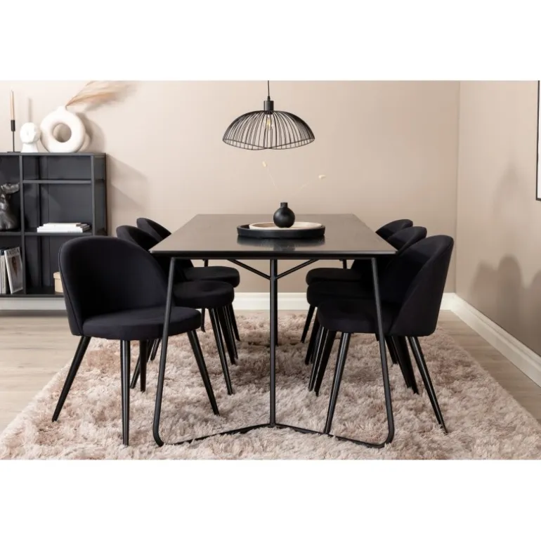 Hvad mere kan du ønske dig end en Spisebordssæt, der både er komfortabel, stilfuld og skaber en luksuriøs følelse i rummet? Det er præcis, hvad denne moderne kombination tilbyder! Spisebordet Petra har et velgennemtænkt design med skandinaviske former, der giver en elegant følelse, smalle, let udfladede ben i jern og en bordplade i sort MDF med finer. Bordmål: Længde: 190 cm, Bredde: 90 cm, Højde: 75 cm. Her sammen med 6 velour spisestole i blødt design med metalstoleben og sorte sæder i polyester. Stolmål: Højde: 76,5 cm, sædehøjde: 46,5 cm, bredde: 50 cm, dybde: 57 cm.