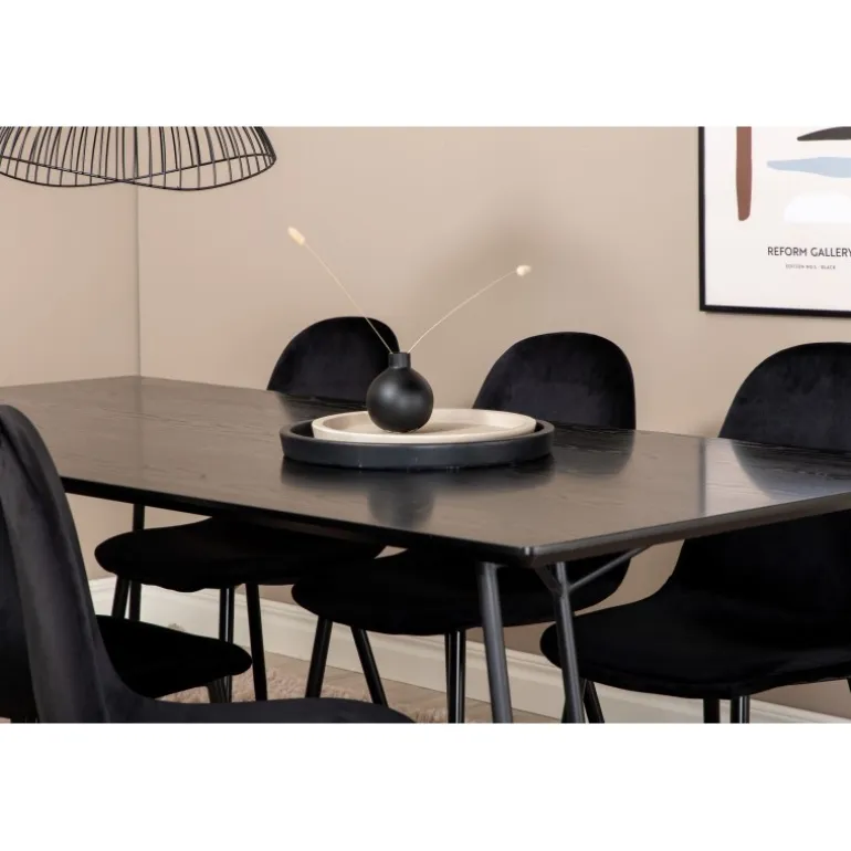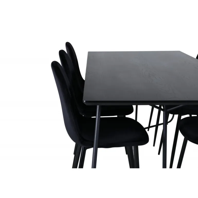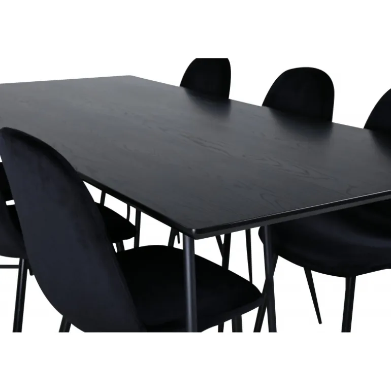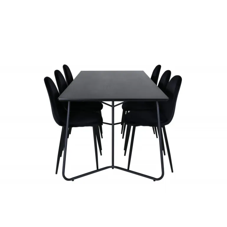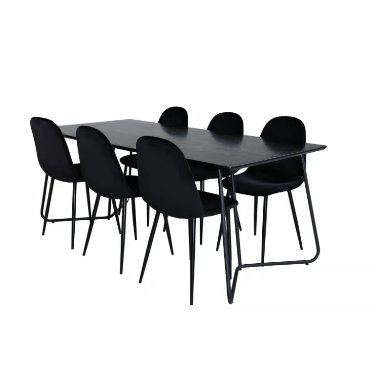 Oplev det delikate Petra Rektangulær Spisebordssæt i en elegant sort farve – stilfuldt, let og indbydende til alle måltider på dagen! Her kombineres spisebordet Petra med spisebordsstole fra Polar-serien. Bordet har et stilrent design med bordplade i sort MDF med finer og let udstillede bordben i jern. Bordmål: Længde: 190 cm, Bredde: 90 cm, Højde: 75 cm. De 6 spisebordsstole har smalle ben i metal og en blød, fuldt polstret sæde i velourstof. Stolens mål: Højde: 88 cm, sædehøjde: 41,5 cm, bredde: 42,5 cm, dybde: 53,3 cm. Lad dette smukt matchende Spisebordssæt med en moderne følelse blive et naturligt samlingssted i dit hjem.