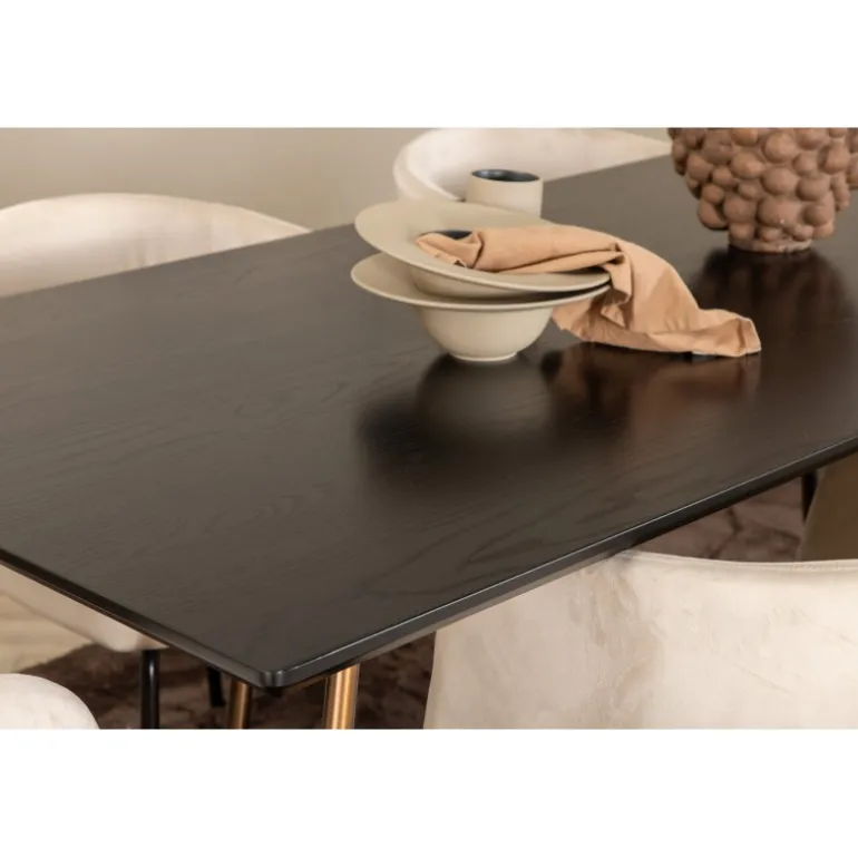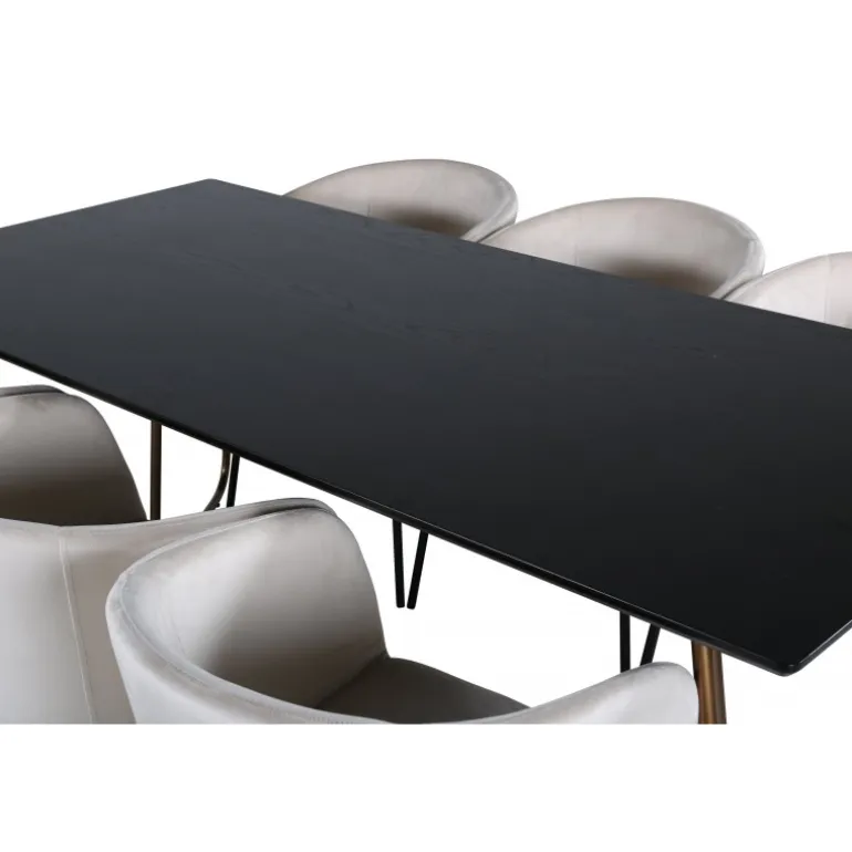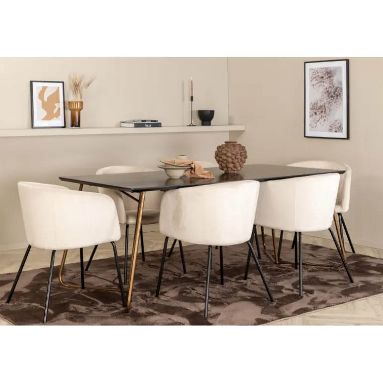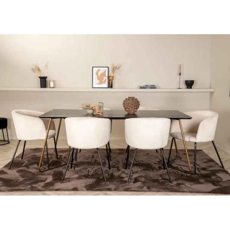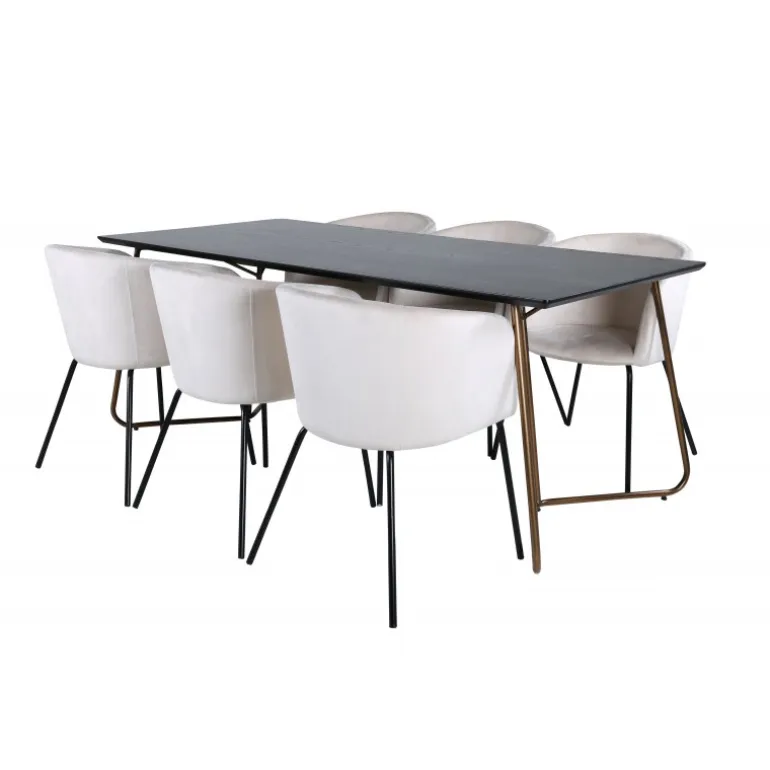 Sæt dig til rette i denne indbydende og stilfulde Spisebordssæt til lange middage med familie og venner! Spisebordet Petra har et gennemtænkt design med skandinaviske former, der giver en elegant følelse. Smal, let skrånende ben i kobberfarvet jern og en bordplade i sort MDF med finer. Bordmål: Længde: 190cm, Bredde: 90cm, Højde: 75cm. Her i perfekt kombination med 6 komfortable spisestole fra Berit-serien. Stolebenene er i sort jern, og den fuldt polstrede sæde er i blødt fløjlsstof. Stolemål: Højde: 78cm, sædehøjde: 49cm, bredde: 55cm, dybde: 55cm. Et luksuriøst og stilfuldt Spisebordssæt, der inviterer til lange middagsstunder!