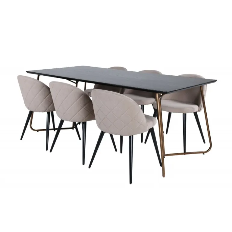 Hvad mere kan du ønske dig end et Spisebordssæt, der både er komfortabelt, stilfuldt og giver en luksuriøs følelse til rummet? Det er præcis, hvad denne moderne kombination tilbyder! Spisebordet Petra har et gennemtænkt design med skandinaviske former, der giver et stilfuldt udseende, smalle, let udadvendte ben i jern og en bordplade i sort MDF med finer. Bordets dimensioner: Længde: 190 cm, Bredde: 90 cm, Højde: 75 cm. Her sammen med 6 Velvet spisebordsstole i blødt design med sorte metalstoleben og beige sæder i polyesterlin. Stolens dimensioner: Højde: 76,5 cm, sædehøjde: 46,5 cm, bredde: 50 cm, dybde: 57 cm.