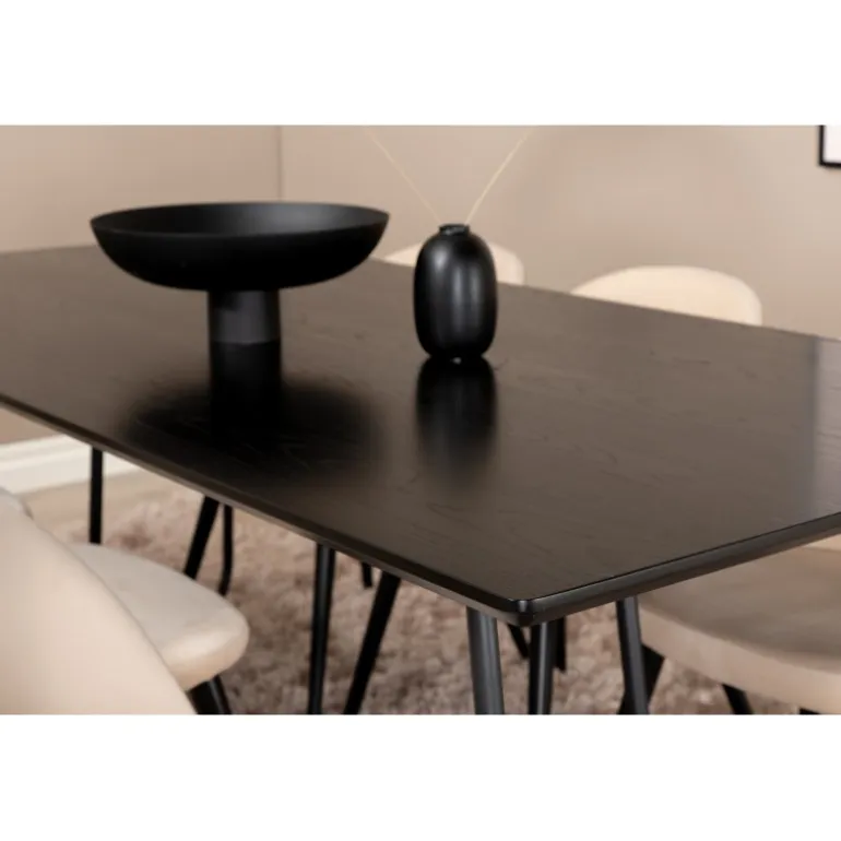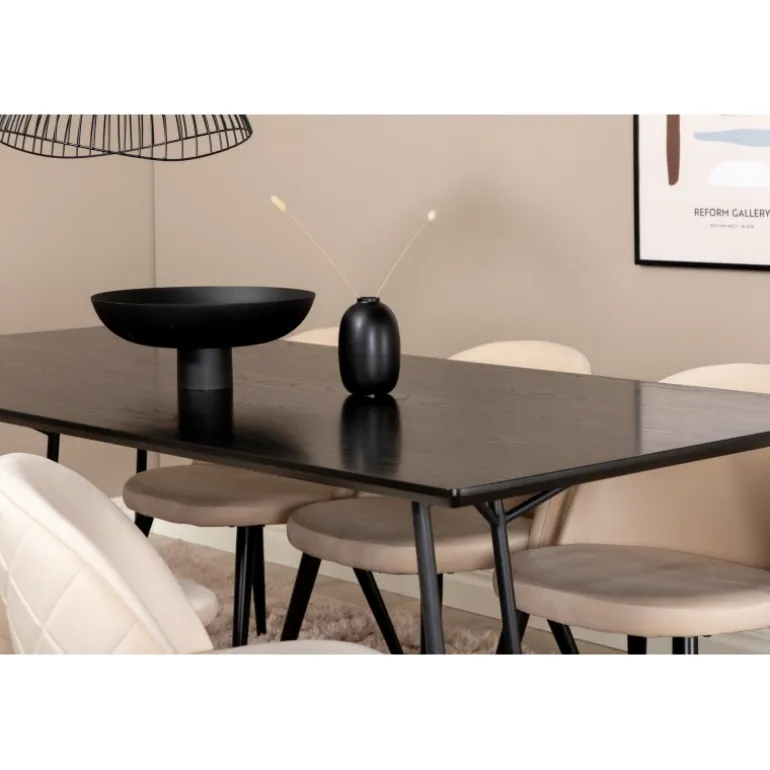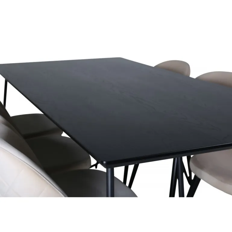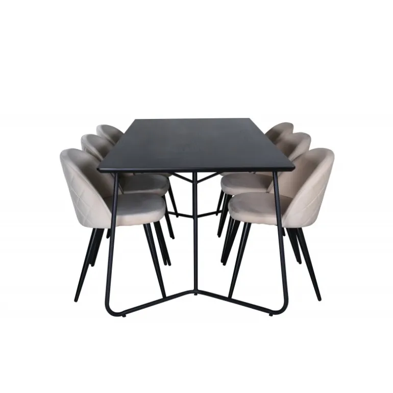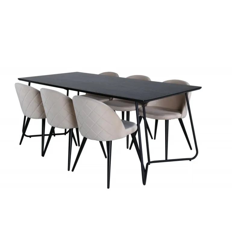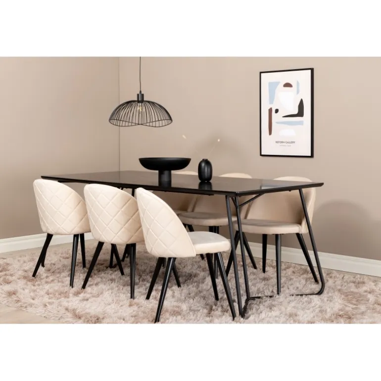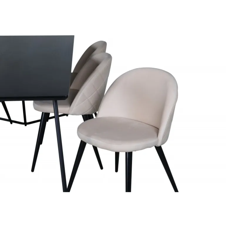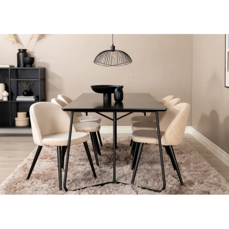 Hvad mere kan du ønske dig end et Spisebordssæt, der både er komfortabelt, stilfuldt og giver en luksuriøs følelse til rummet? Det er præcis, hvad denne moderne kombination tilbyder! Spisebordet Petra har et gennemtænkt design med skandinaviske former, der giver en stilfuld følelse, smalle, let udstillede ben i jern og en bordplade i sort MDF med finer. Bordets dimensioner: Længde: 190 cm, Bredde: 90 cm, Højde: 75 cm. Her sammen med 6 velour spisestuestole i blødt design med sorte metalben og beige sæder i polyester. Stolens dimensioner: Højde: 76,5 cm, sædehøjde: 46,5 cm, bredde: 50 cm, dybde: 57 cm.