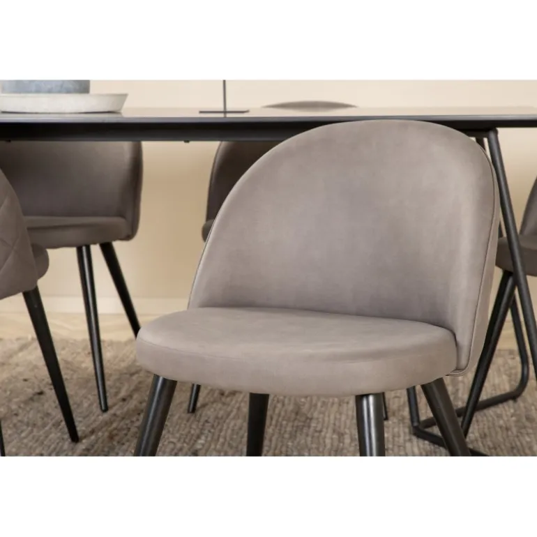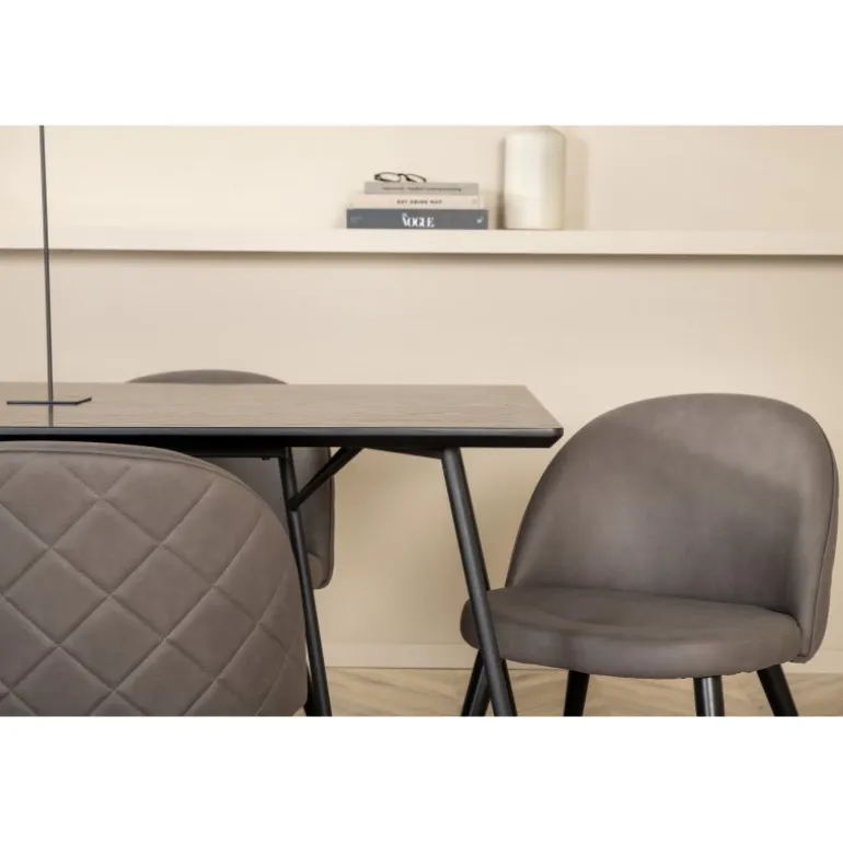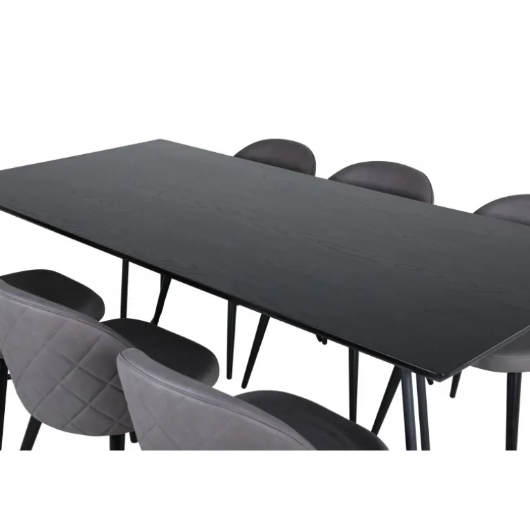 Hvad mere kan man ønske sig end en Spisebordssæt, der både er komfortabel, stilfuld og giver en luksuriøs følelse til rummet? Det er præcis, hvad denne moderne kombination tilbyder! Spisebordet Petra har et gennemtænkt design med skandinaviske former, der giver et stilfuldt udtryk, smalle, let udbuede ben i jern og en bordplade i sort MDF med finer. Bordets dimensioner: Længde: 190 cm, Bredde: 90 cm, Højde: 75 cm. Her sammen med 6 Velvet Stitches spisestole i blødt design med sort metalstolben og grå sæder i mikrofiber. Stolens dimensioner: Højde: 76,5 cm, sædehøjde: 46,5 cm, bredde: 50 cm, dybde: 57 cm.