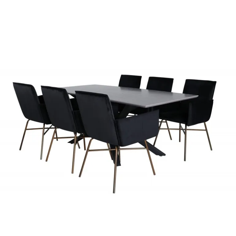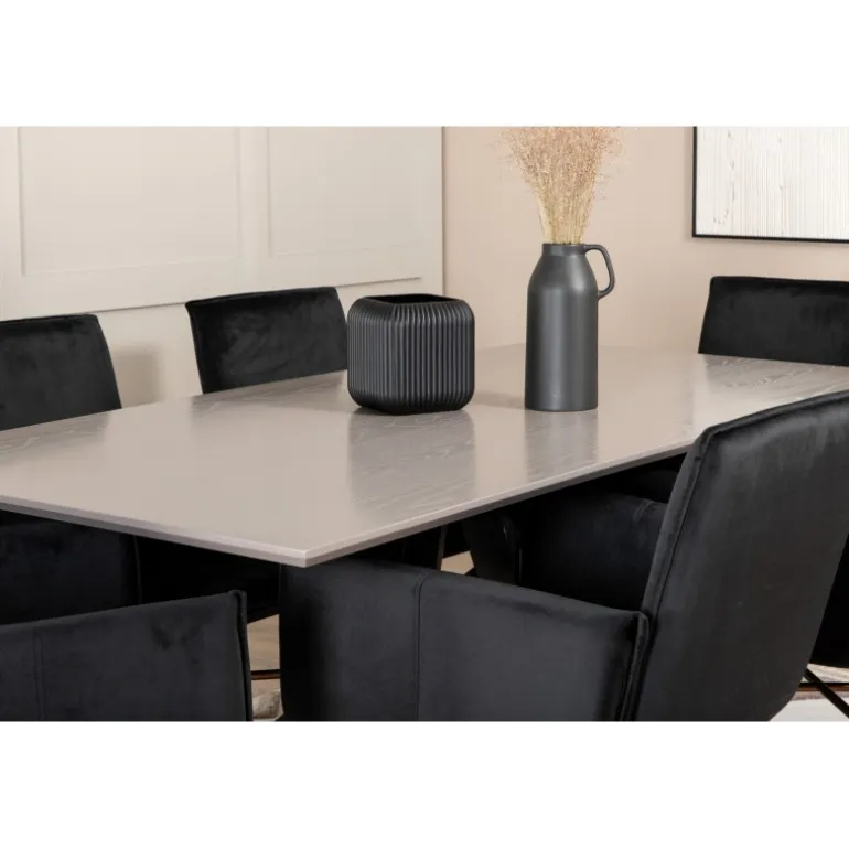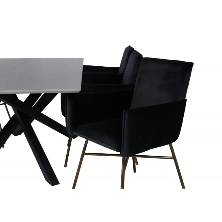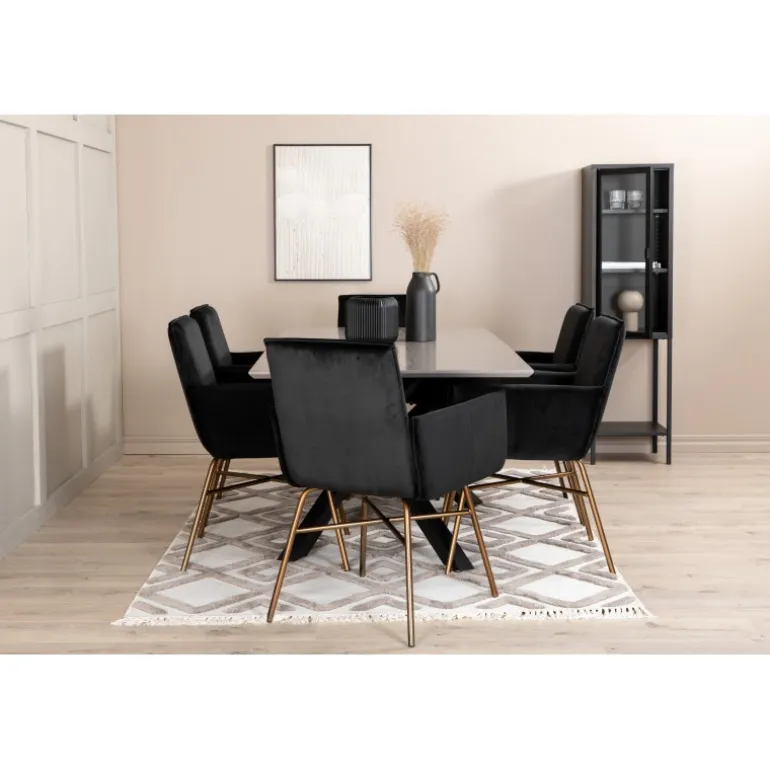 Petra spisebordsstole imponerer med deres luksuriøse design og høje komfort! Stolens ben er i kobberfarvet jern, og sædet er i elegant sort fløjl. Stolens dimensioner: Højde: 87 cm, sædehøjde: 48 cm, bredde: 57 cm, dybde: 60 cm. Vores 6 spisebordsstole er her matchet med Piazza, vores populære rektangulære spisebord med luksuriøs fornemmelse og trendy detaljer i designet. Bordpladen i grå farve er lavet af MDF. Stellet har et lækkert look med krydsben i sort jern, der skaber et stabilt blikfang. Bordets dimensioner: Længde: 190 cm, bredde: 90 cm, højde: 76 cm.