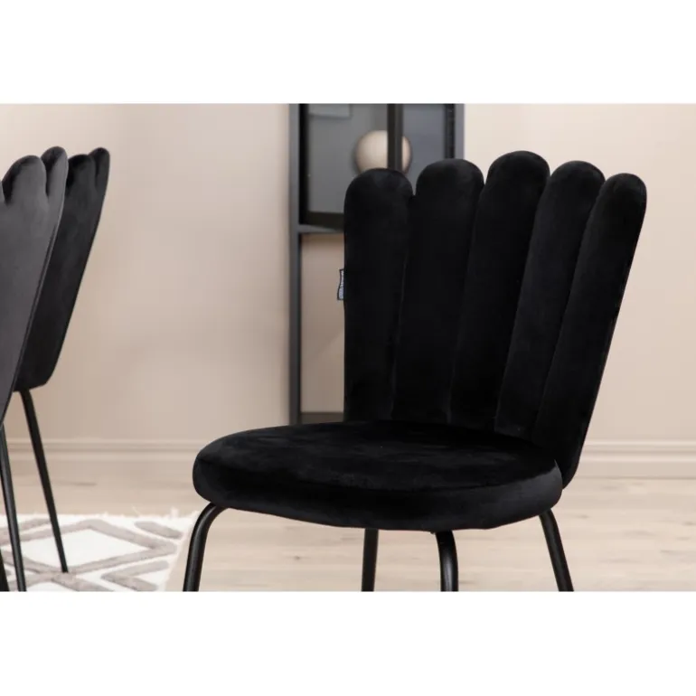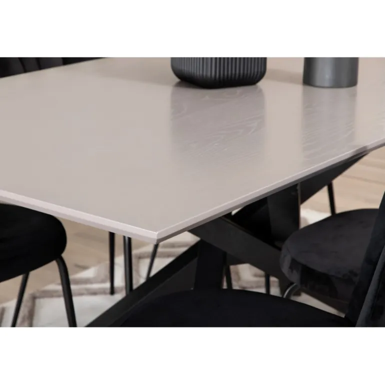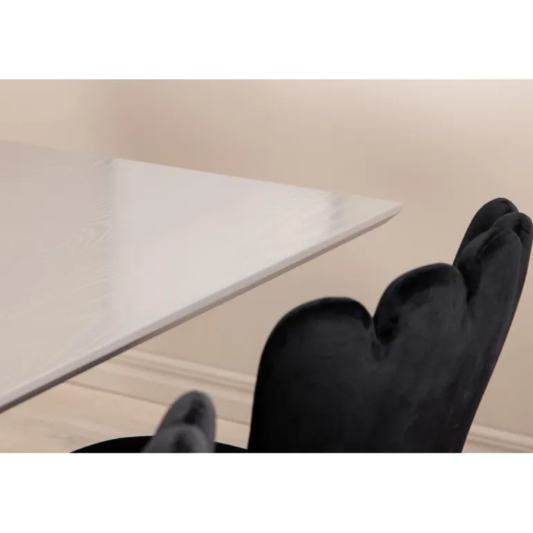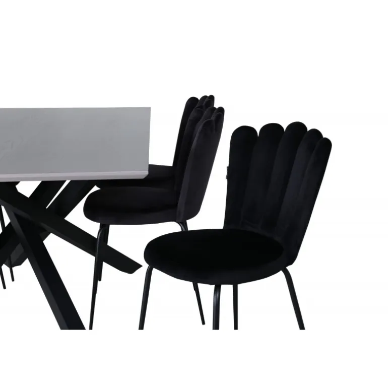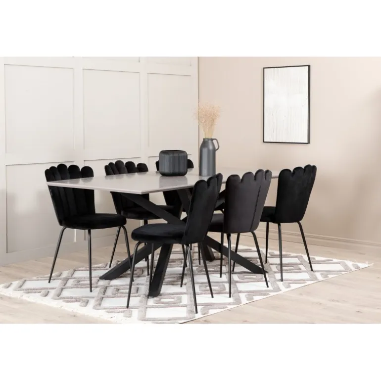 Limhamn spisebordsstol er en moderne favorit i mange husstande. Den har et indbydende design med dekorative ormformede ryglæn med dekorative sømme og en rund sæde i sort velourstof og stoleben i pulverlakeret metal. Stoldimensioner: Højde: 82,5 cm, sædehøjde: 48 cm, bredde: 44,5 cm, dybde: 54 cm. Her i perfekt kombination med vores rektangulære spisebord Piazza. Bordet har en tynd lysegrå bordplade lavet af MDF og en dekorativ ramme med krydsben i sort jern, der skaber et stabilt blikfang. Bordsdimensioner: Længde: 190 cm, Bredde: 90 cm, Højde: 76 cm.