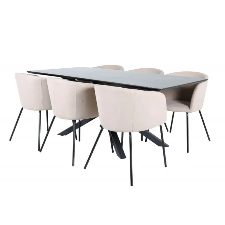Piazza er vores populære rektangulære spisebord med en luksuriøs følelse og trendy detaljer i designet. Bordpladen er lavet af MDF-finér i en smuk sort farve, og stellet skaber et stabilt blikfang med krydsben i sort jern. Her i en vidunderlig kombination med vores elegante spisebordsstole fra Berit-serien. Stolen har et luksuriøst design i beige polyesterlinned, og stolens ben er stilfuldt smalle i sort jern. Indret indbydende og skab et stilfuldt look i dit hjem!