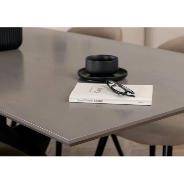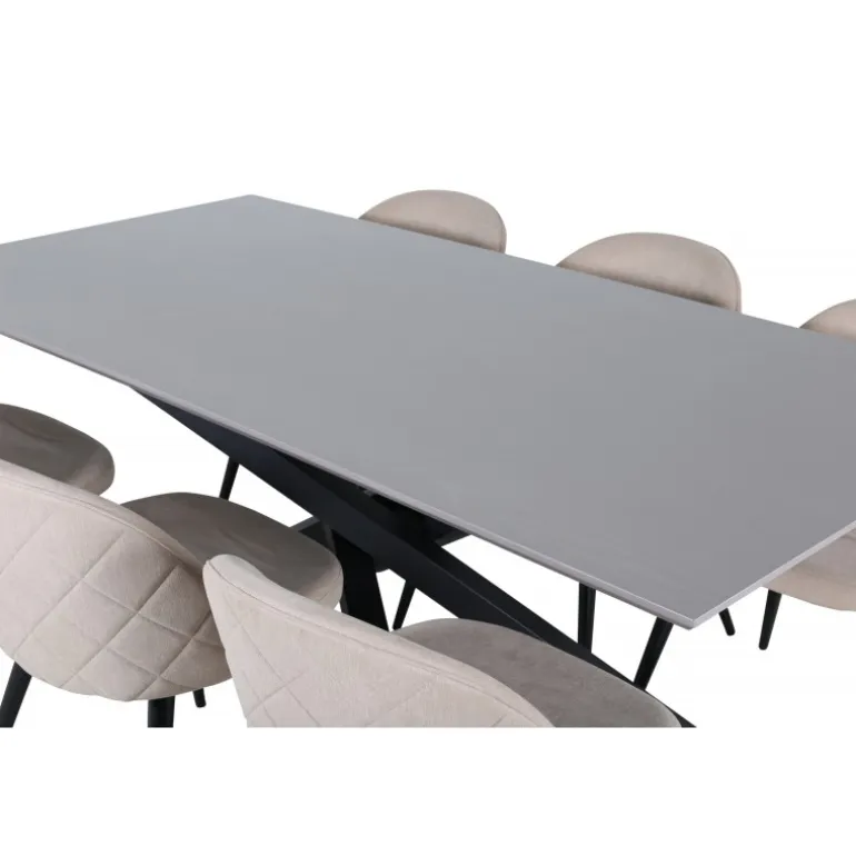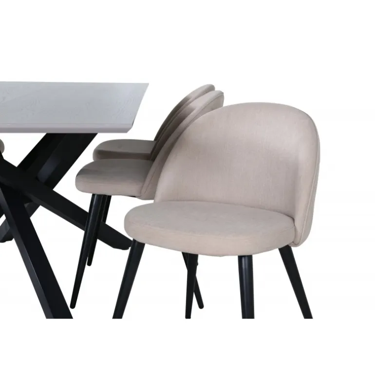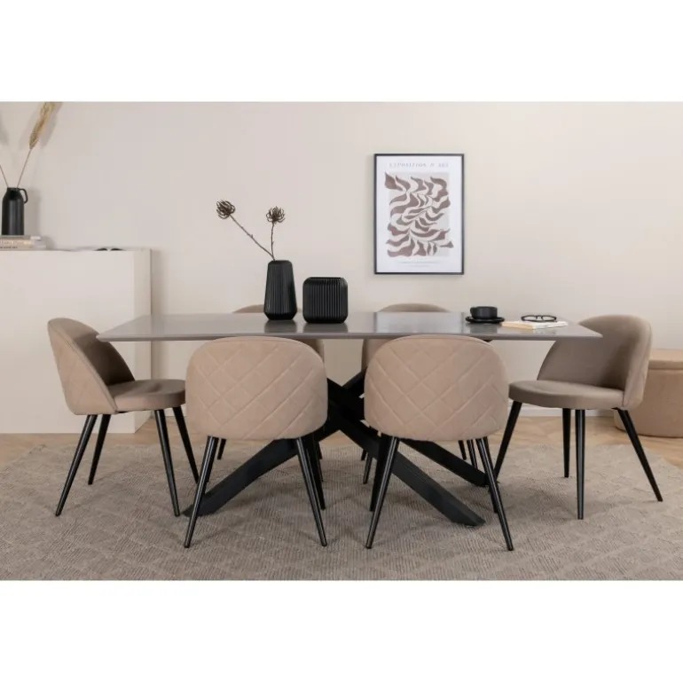 Skab en hjemlig atmosfære med et charmerende Spisebordssæt! Piazza er vores populære rektangulære spisebord med luksuriøs fornemmelse og trendy detaljer i designet. Bordpladen er lavet af MDF-finer i en smuk grå farve, og kroppen skaber en stabil blikfang med krydsben i sort jern. Her i dejlig kombination med spisestole fra Velvet Stitches-serien, som bidrager til en flot helhed i stuen. Stolebenene er let udfladede i sort jern, og de beige sæder er i polyester linned. Nyd behagelige måltider!