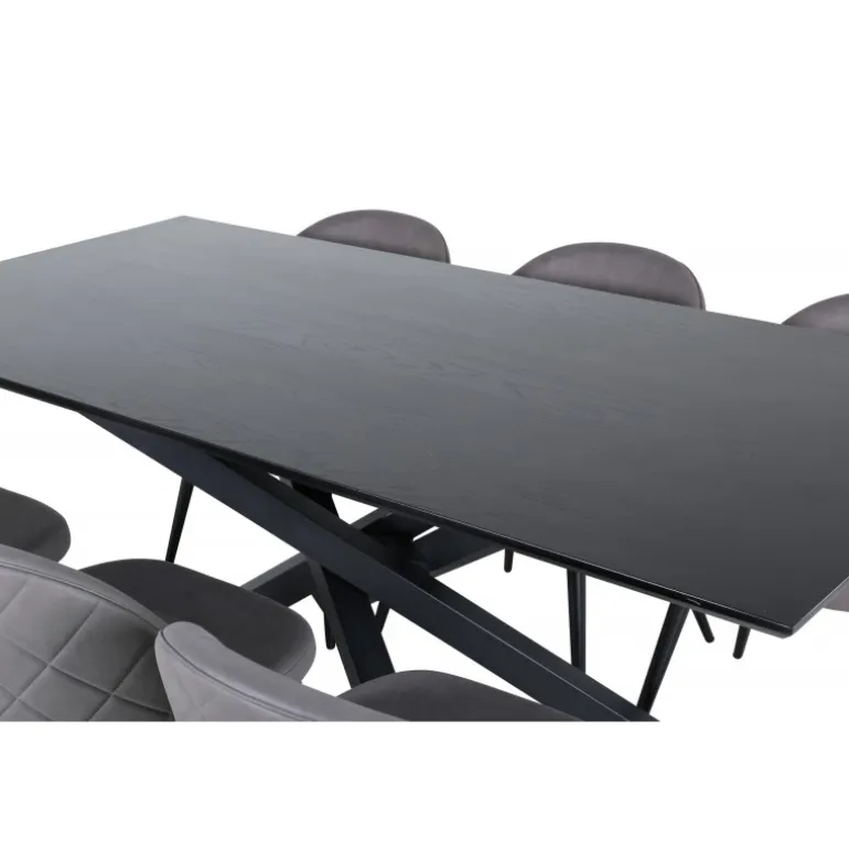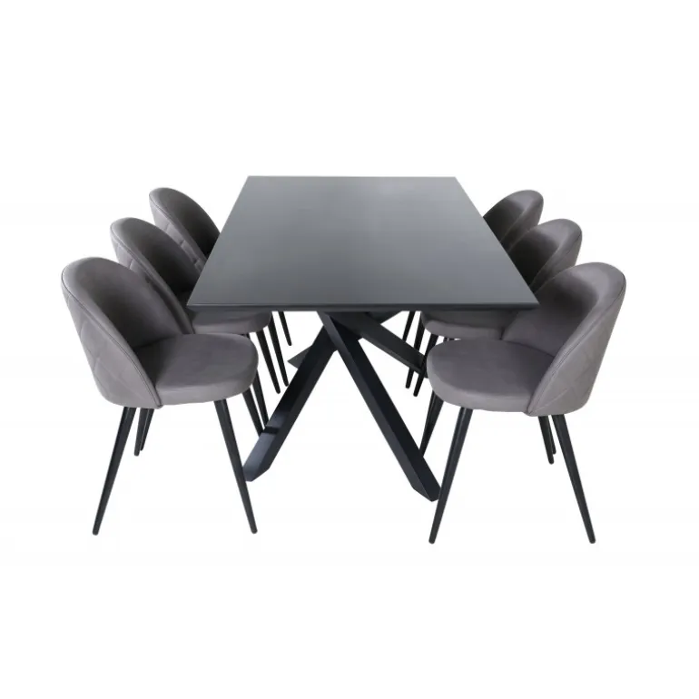 En charmerende Spisebordssæt med lækkert design! Piazza er vores populære rektangulære spisebord med luksuriøst præg og trendy detaljer i designet. Bordpladen er lavet af MDF-finer i en smuk sort farve, og stellet skaber en stabil blikfang med krydsben i sort jern. Her i en lækker kombination med spisestole fra Velvet Stitches-serien, som bidrager til en flot helhed i stuen. Stolebenene er let udfladede i sort jern, og sæderne er fuldt beklædt i grå mikrofiber. Sid komfortabelt i dit hjem!