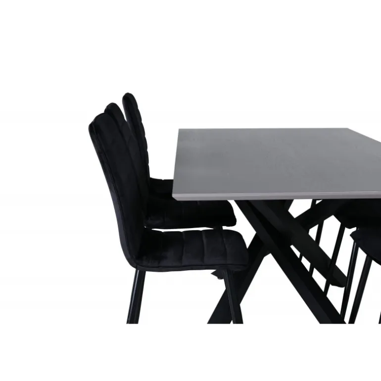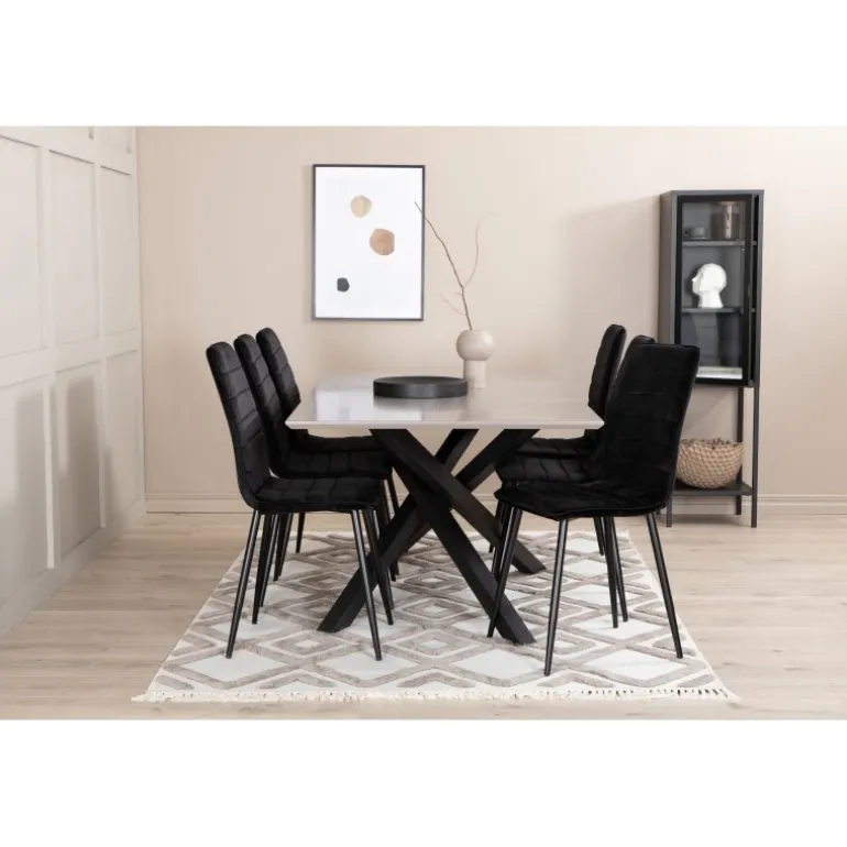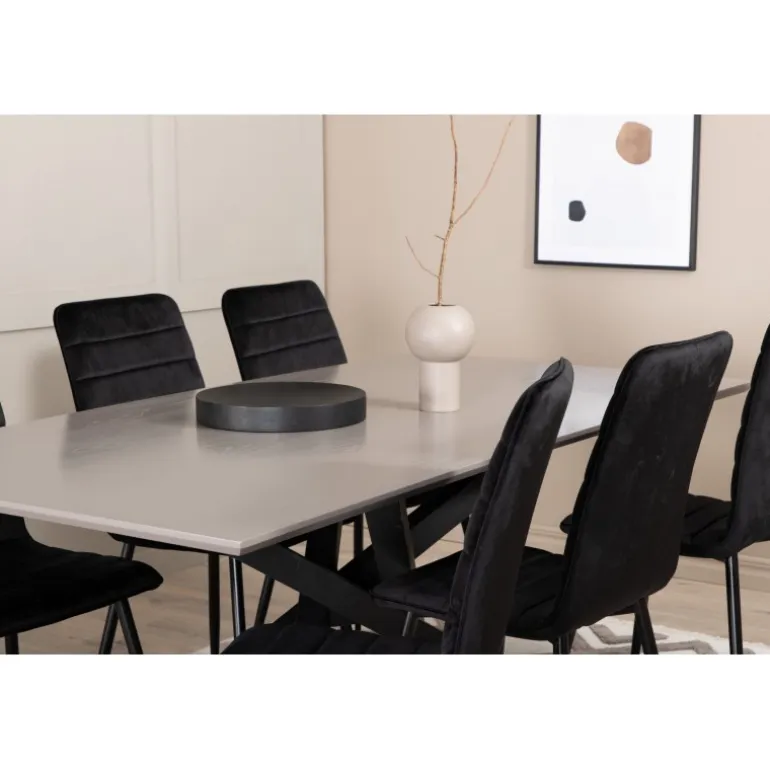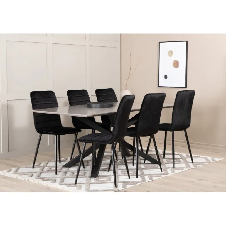 Tilføj et strejf af luksus til dit hjem med Piazza Rektangulær Spisebordssæt. Dette moderne Spisebordssæt kombinerer stil og funktionalitet med seks Windu luksus spisestuestole i sort fløjl og en elegant Piazza rektangulær spisebord. Stolene har en strømlinet design med jernben, mens bordet imponerer med en MDF bordplade i grå farve og krydsben i sort jern. Bordets dimensioner er længde: 190cm, bredde: 90cm, højde: 76cm, og stolene måler højde: 94cm, sædehøjde: 47cm, bredde: 43cm, dybde: 49cm. Gør hverdagens måltider til en udsøgt oplevelse!