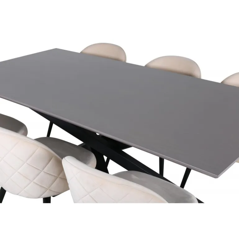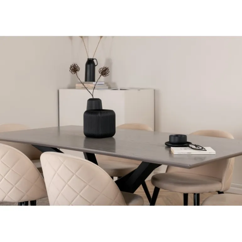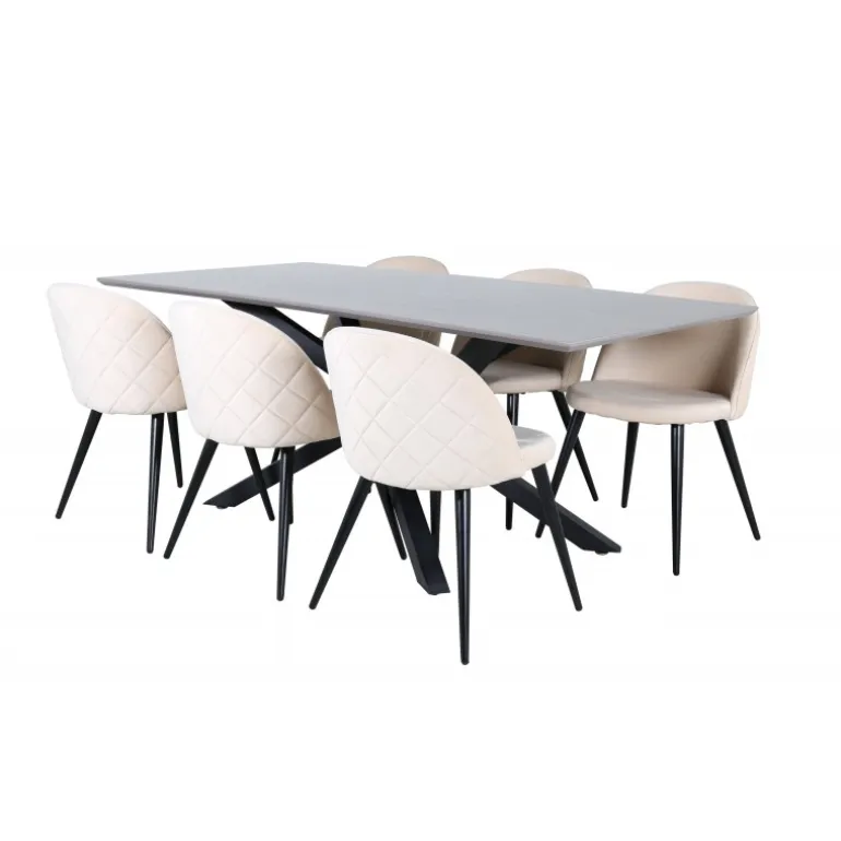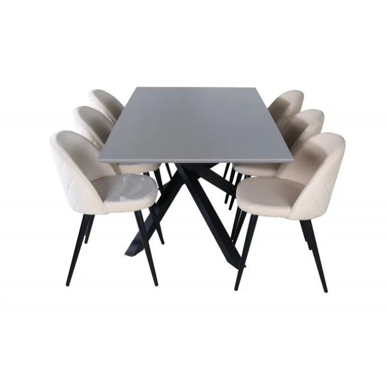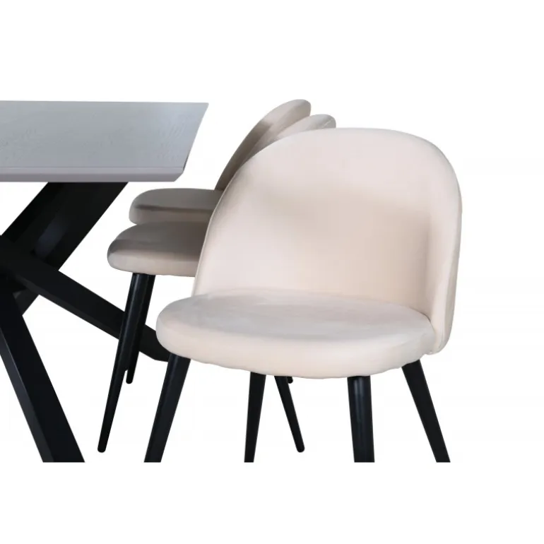Et charmerende madgruppe med lækkert design! Piazza er vores populære rektangulære spisebord med luksuriøs følelse og trendy detaljer i designet. Bordpladen er lavet af MDF-finer i en krydset grå farve, og stellet skaber et solidt blikfang med krydsben i sort jern. Her i lækker kombination med spisebordsstole fra Velvet Stitches-serien, som bidrager til en dejlig helhed i stuen. Stolebenene er let udadbuede i sort jern, og sæderne er fuldt polstrede i beige fløjlsstof. Sid komfortabelt i dit hjem!