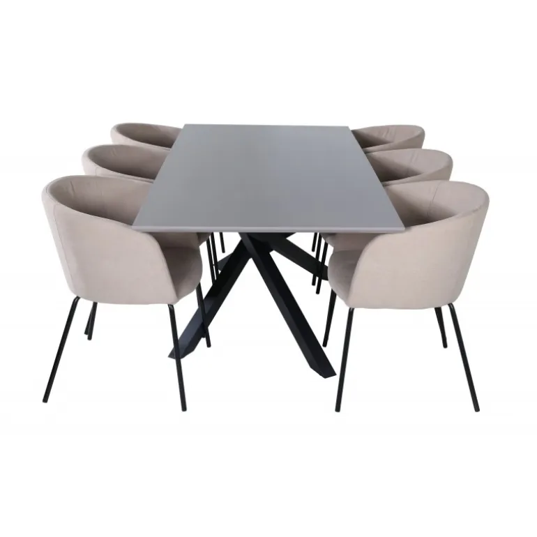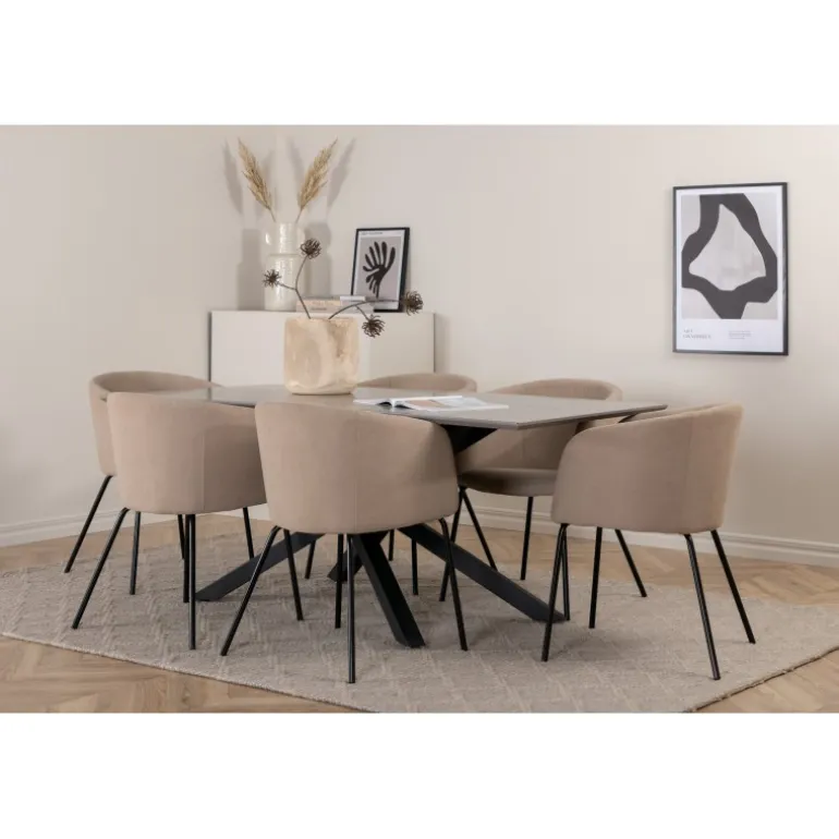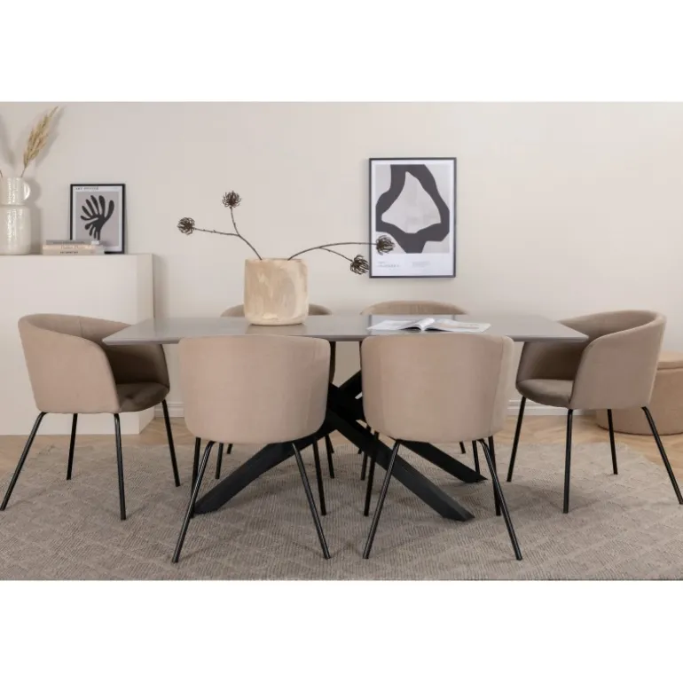 Piazza er vores populære rektangulære spisebord med en luksuriøs følelse og trendy detaljer i designet. Bordpladen er lavet af MDF-finer i en grå farve, og kroppen skaber en stabil blikfang med krydsben i sort jern. Her i vidunderlig kombination med vores elegante spisestole fra Berit-serien. Stolen har et luksuriøst design i beige polyesterlærred, og stolebenene er stilfuldt smalle i sort jern. Indret indbydende og skab et stilfuldt look i dit hjem!