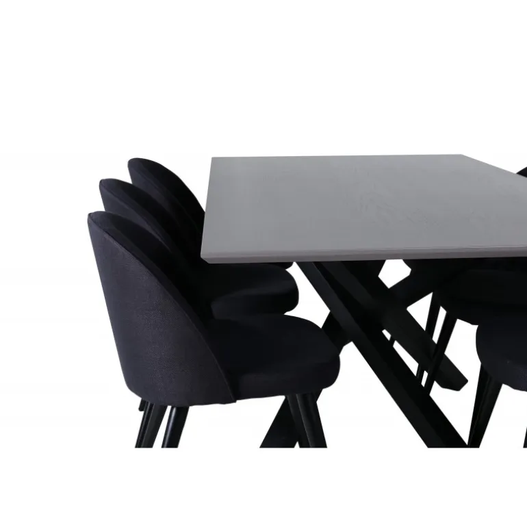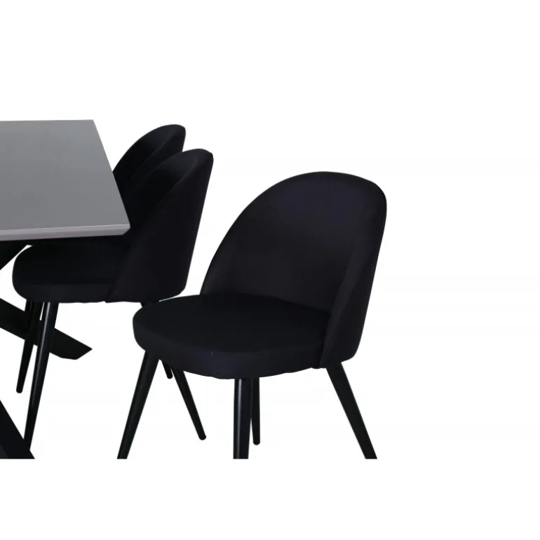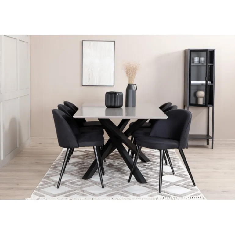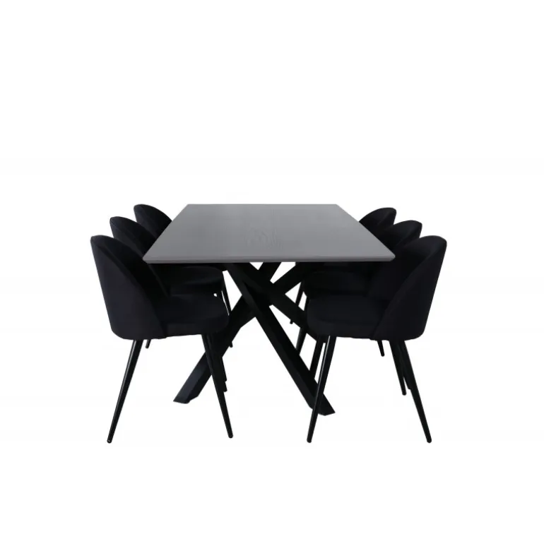 Pynt hjemmets hjerte med vores designbord Piazza og nyd dejlige måltider! Piazza er et rektangulært bord med en grå bordplade lavet af MDF og har en dekorativ ramme med sorte jernkrydsben, som skaber en stabil blikfanger. Bordets dimensioner: Længde: 190 cm, Bredde: 90 cm, Højde: 76 cm. Her sammen med 6 velour spisestole i sort polyester og udsvajede metalstoleben. Stolens dimensioner: Højde: 76,5 cm, sædehøjde: 46,5 cm, bredde: 50 cm, dybde: 57 cm. Indret med guldkant i hverdagen – det skal føles rart at komme hjem!