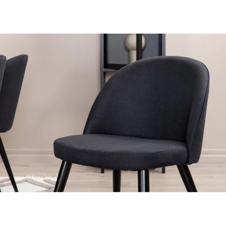 - 6 velour spisestole i sort polyester med udsvajede metalstoleben