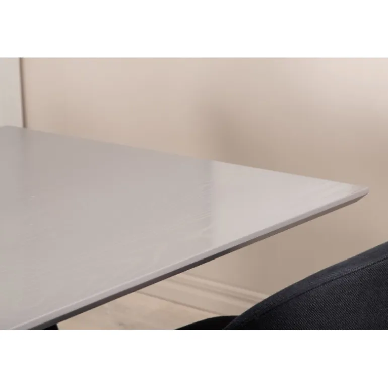 - Rektangulært bord med grå MDF bordplade og sorte jernkrydsben