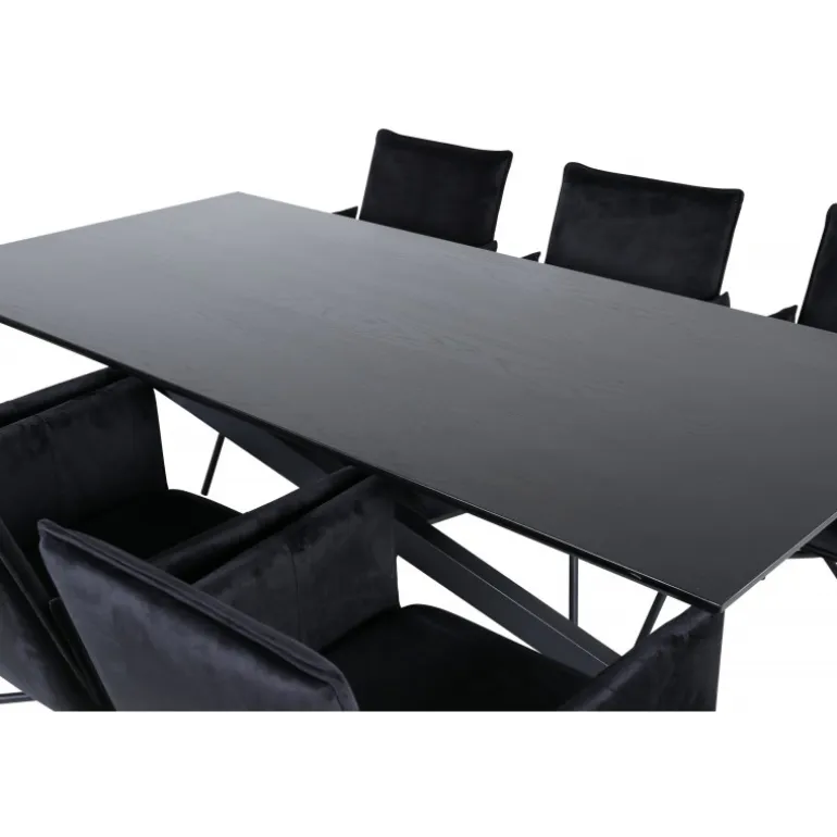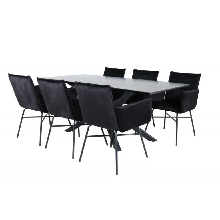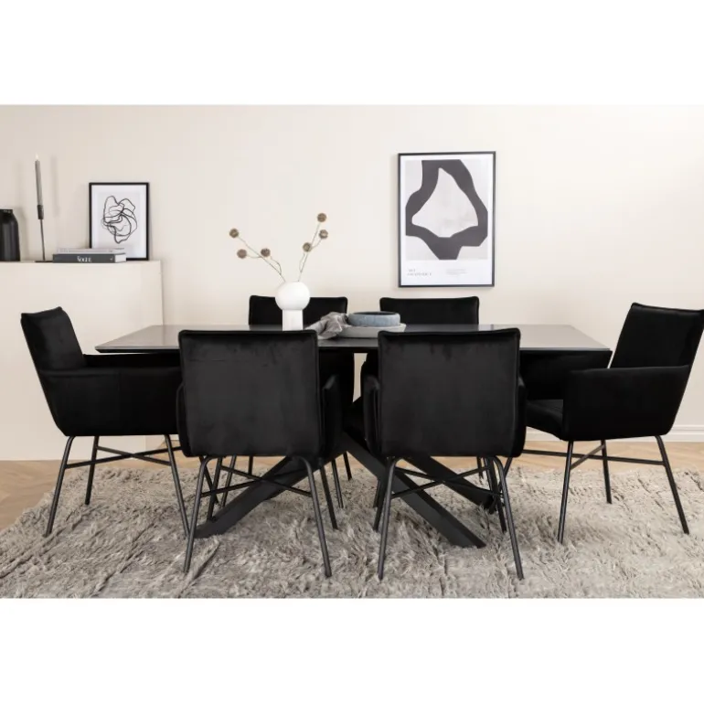 Stilfuldt, komfortabelt og elegant – hvad mere kan man ønske sig? Piazza er vores populære rektangulære spisebord med luksuriøs fornemmelse og trendy detaljer i designet. Bordpladen er lavet af MDF-finer i en udtværet sort farve, og kroppen skaber en solid blikfanger med krydsben i sort jern. Her sammen med vores lækre spisebordsstole Petra. Stolene har en behagelig sædedybde, stolebenene er stilfuldt smalle i jern, og sædet er i sort fløjlsstof, som giver en flot glans til rummet. Nyd behagelige måltider fremover!