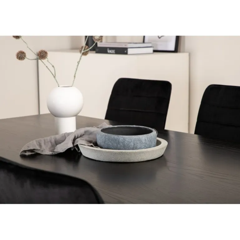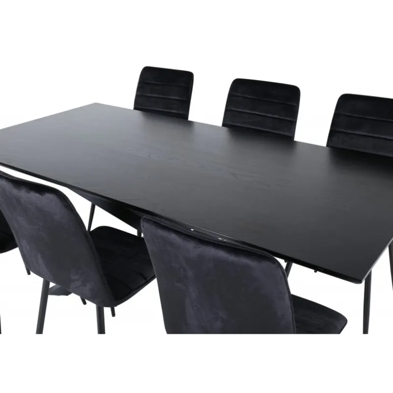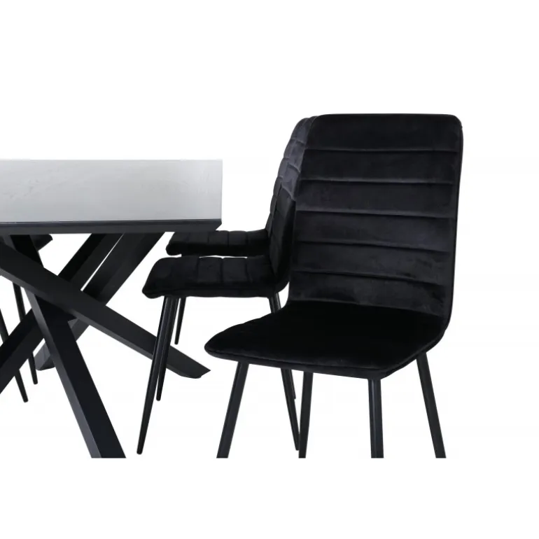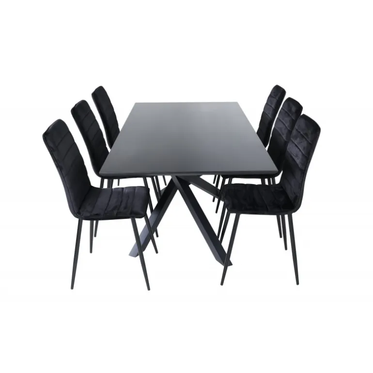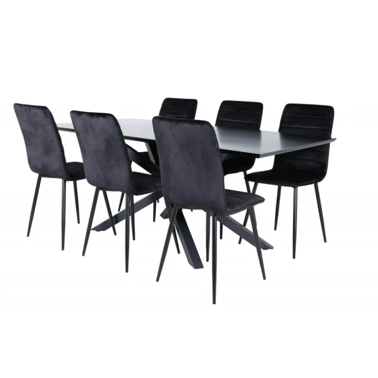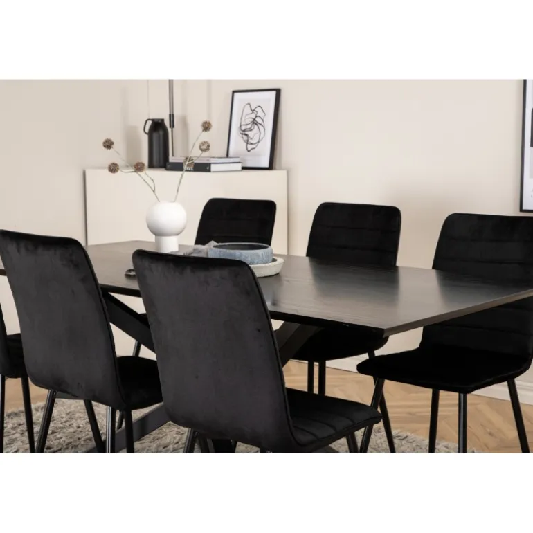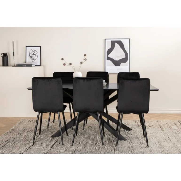 En fuld sort madgruppe går aldrig af mode! Piazza er vores populære rektangulære spisebord med luksuriøs fornemmelse og trendy detaljer i designet. Bordpladen er lavet af MDF-finér i en smurt sort farve, og kroppen skaber en stabil blikfang med krydsben i sort jern. Her sammen med 6 Windu luksus spisebordsstole i lige design. Stolene har sorte sæder i fløjl, som giver en flot glans til rummet, og smalle stoleben i jern. Her sidder du og dine gæster komfortabelt i lang tid!