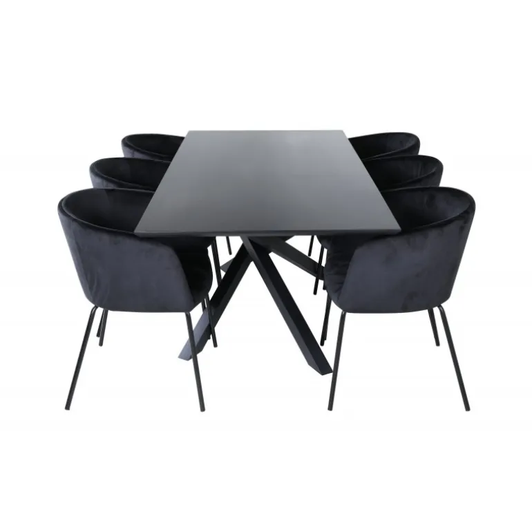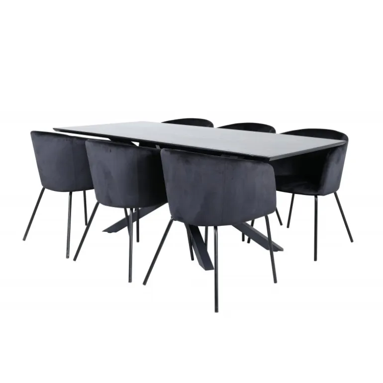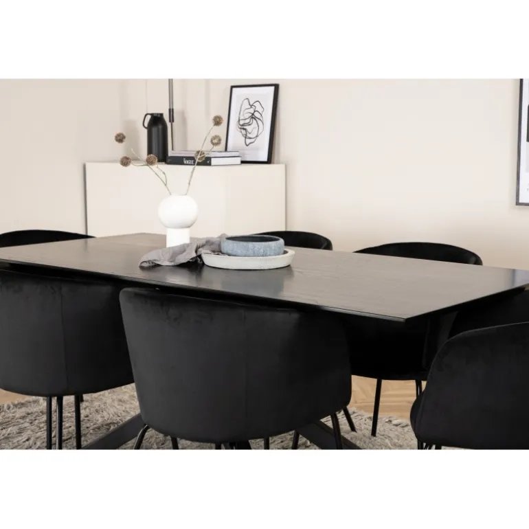 Piazza Rektangulært Spisebordssæt er det perfekte valg til at skabe en trendy og indbydende atmosfære i dit hjem. Piazza er vores populære rektangulære spisebord med en luksuriøs følelse og trendy detaljer i designet. Bordpladen er lavet af MDF-finer i en flot sort farve, og stellet danner en stabil blikfanger med krydsben i sort jern. Sættet kombineres smukt med vores elegante spisebordsstole fra Berit-serien. Stolen har et luksuriøst design i sort fløjlstof, og stolebenene er stilfuldt slanke i sort jern. Indret din spisestue med stil og skab et moderne look!