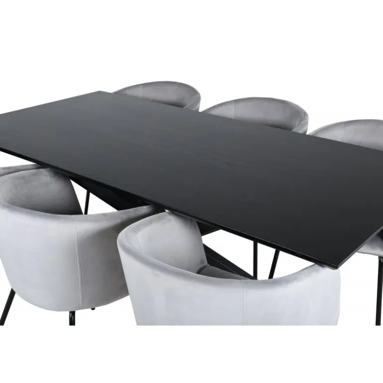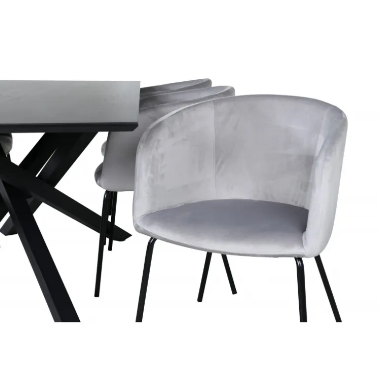 Indret dit hjem med stil og skab en indbydende atmosfære! Piazza er vores populære rektangulære spisebord med luksuriøs fornemmelse og trendy detaljer i designet. Bordpladen er lavet af MDF-finér i en smurt sort farve, og kroppen skaber en stabil blikfang med krydsben i sort jern. Her i en vidunderlig kombination med vores elegante spisebordsstole fra Berit-serien. Stolen har et luksuriøst design i gråt velourstof, og stolebenene er stilfuldt smalle i sort jern. Sid behageligt og nyd hyggelige måltider!