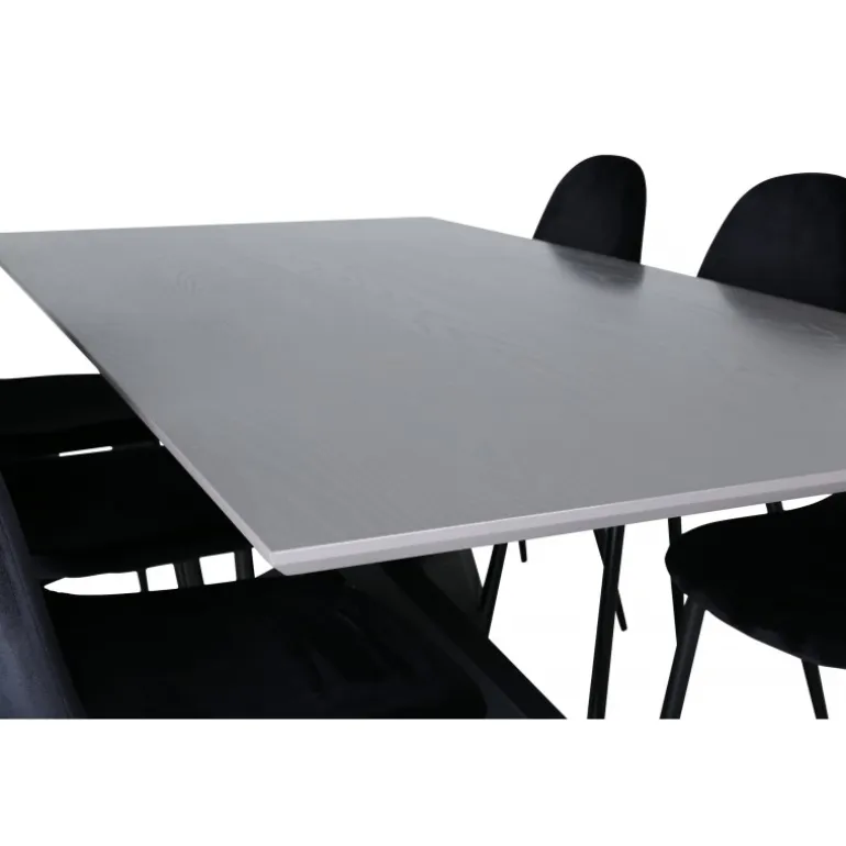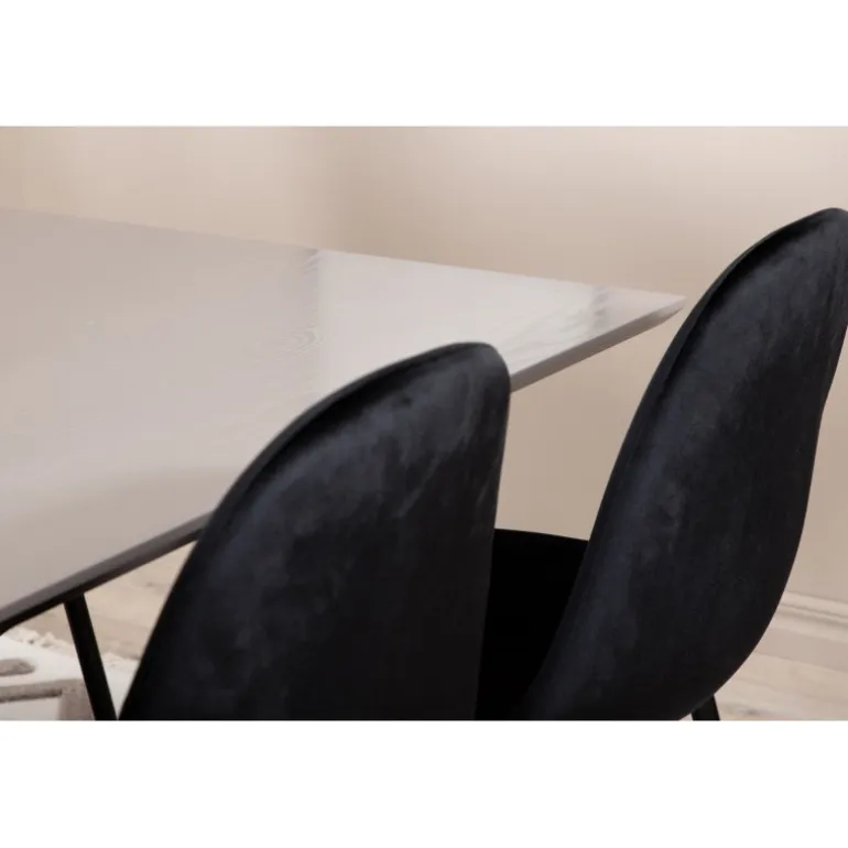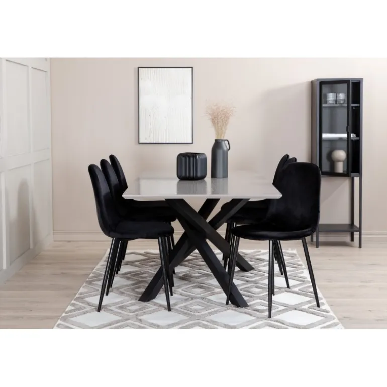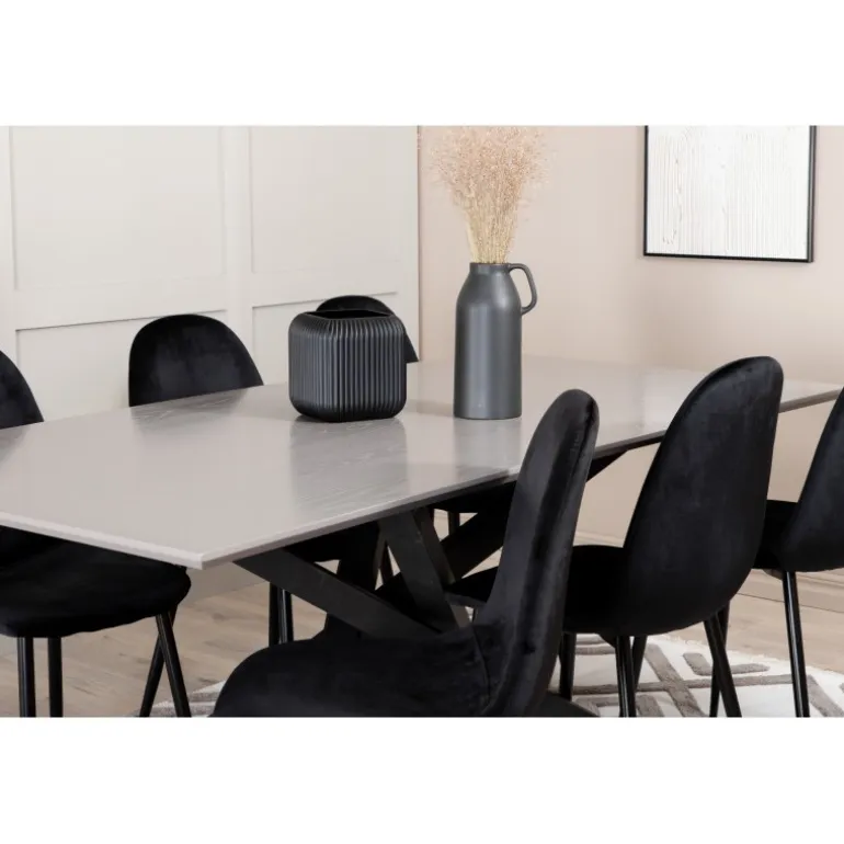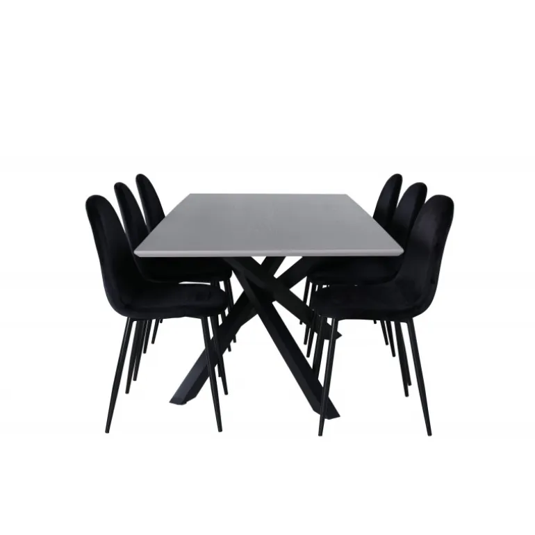 Brug for et guldkantet indslag i hverdagen? Vores populære Spisebordssæt Piazza i rektangulært design har en grå bordplade lavet af MDF og en dekorativ ramme med krydsben i sort jern, som skaber en solid blikfang. Bordmål: Længde: 190 cm, Bredde: 90 cm, Højde: 76 cm. Kombineret her med 6 Polar spisebordsstole i sort velour og stoleben i metal. Stolens dimensioner: Højde: 88 cm, Sædehøjde: 41,5 cm, Bredde: 42,5 cm, Dybde: 53,3 cm. Lad hjemmets hjerte præges af dit nye iøjnefaldende Spisebordssæt.