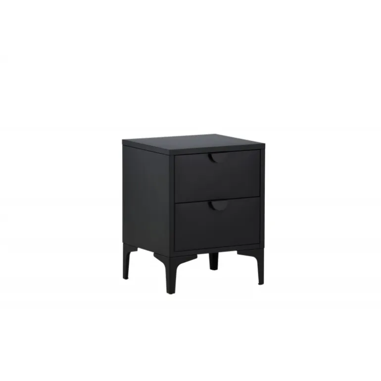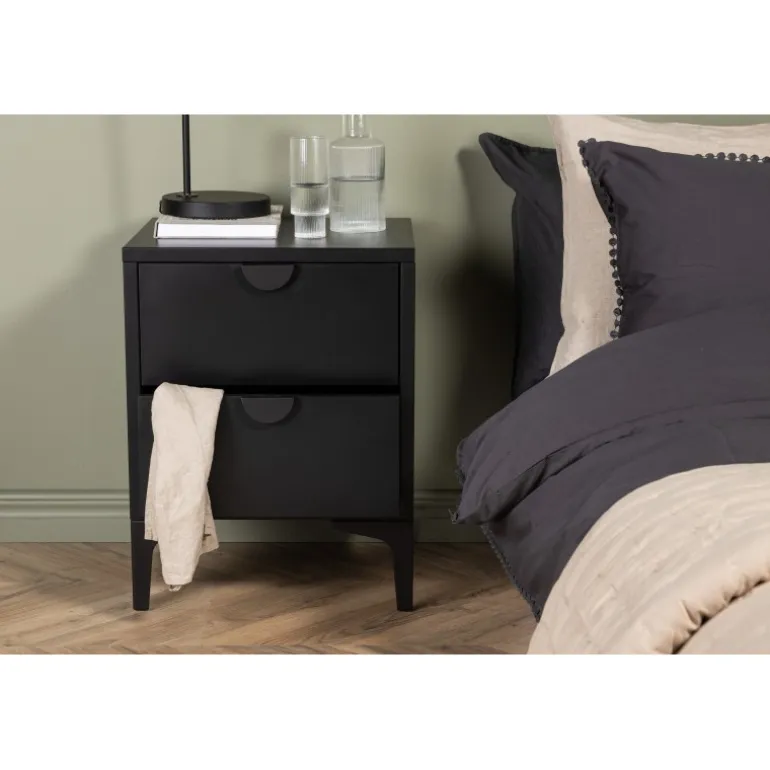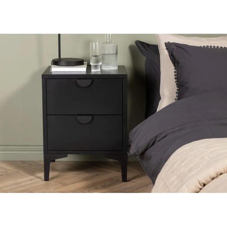 Sengebordet i serien Piring er den perfekte opbevaringsløsning! Det firkantede sengebord i sort stål har to skuffer til skjult opbevaring og en stilfuld top med rigelig plads til en sengelampe, en god bog og eventuel pæn indretningsdekoration for et moderne look. Natbordet er løftet af fire ben, der giver en mere luftig følelse, og det enkle design gør bordet nemt at placere og let at matche. Se vores billeder for inspiration!