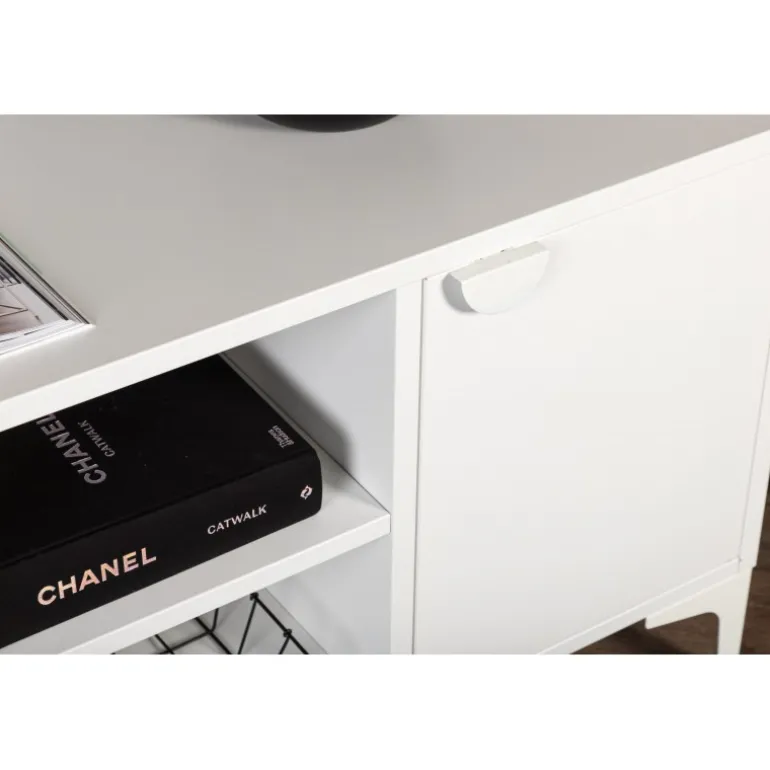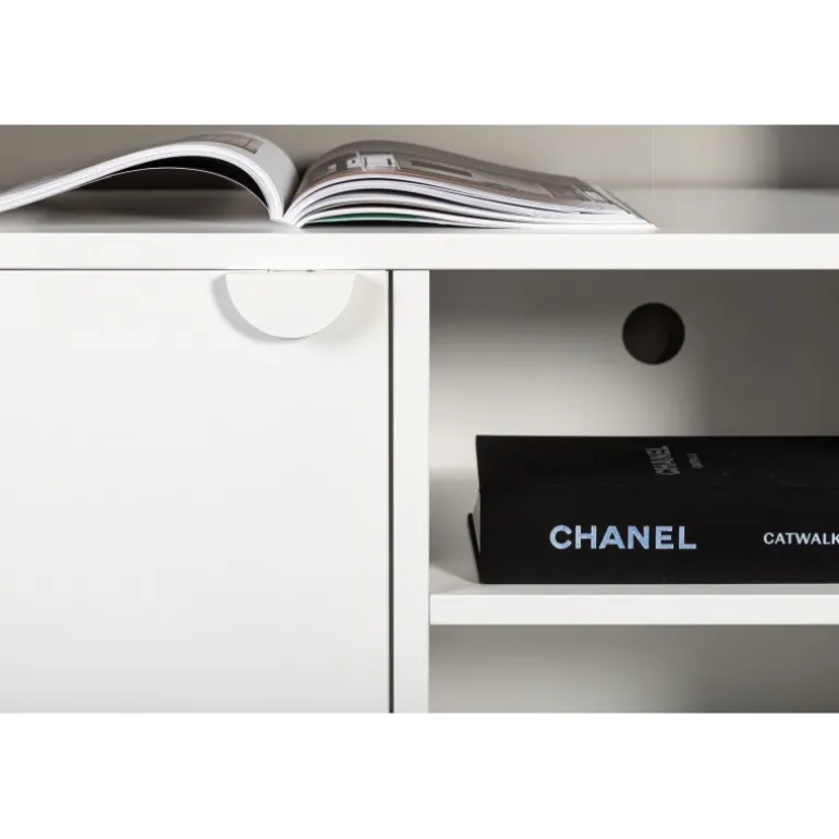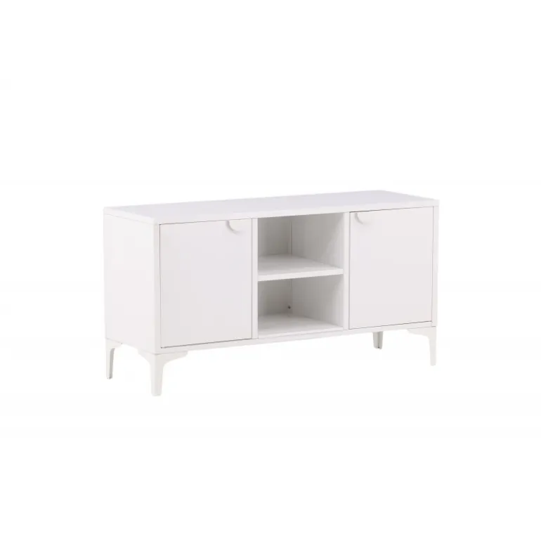 Den perfekte TV-bænk til det moderne og smarte hjem! Denne bænk fra serien Piring er lavet af hvidt stål og har en praktisk dybde, der muliggør masser af opbevaring. Bænken har to hylder med to rum til skjult opbevaring og et center med åben opbevaring – perfekt til stilfulde detaljer såsom en moderne vase eller bog. Designet er simpelthen utrolig gennemtænkt og i overensstemmelse med trenden samt tidløs!