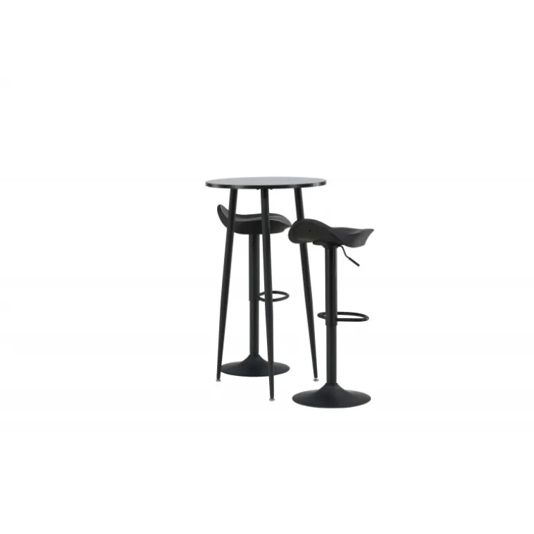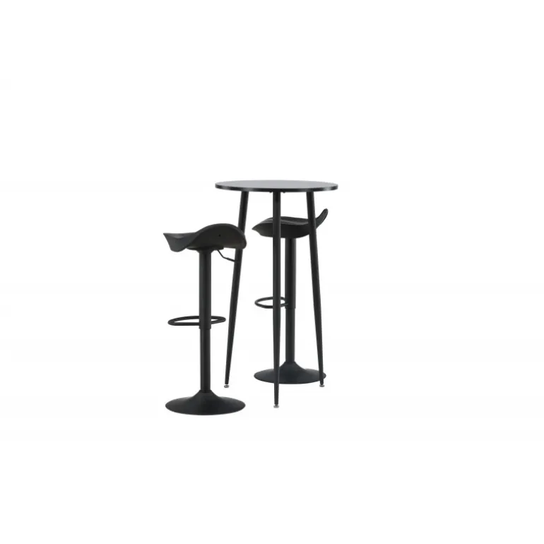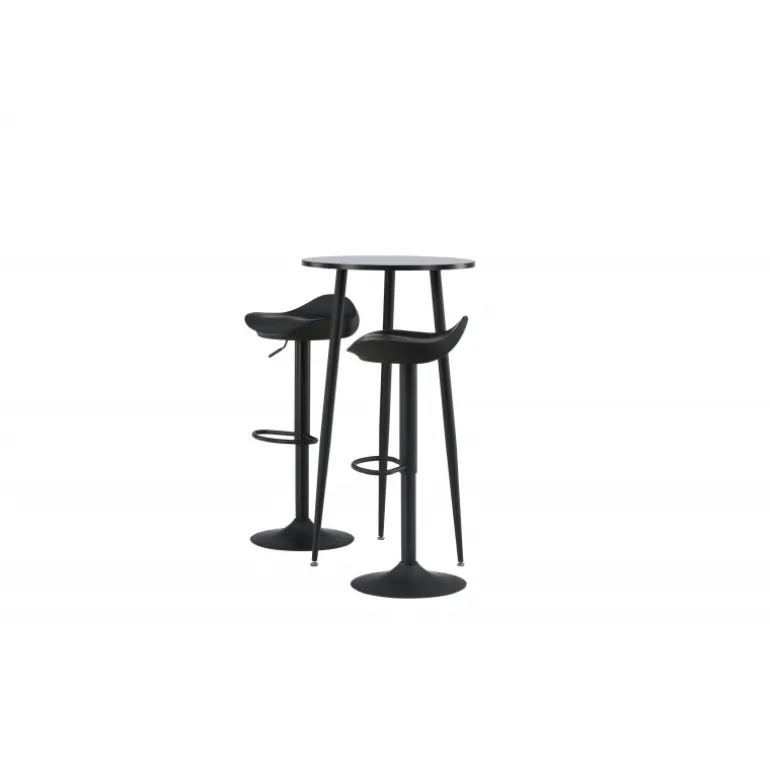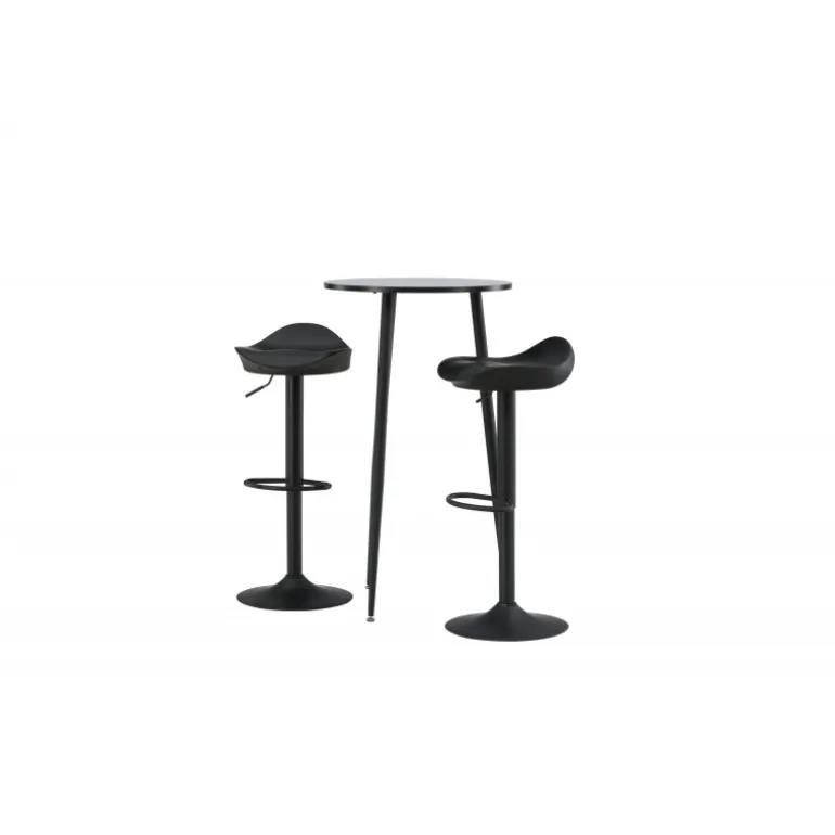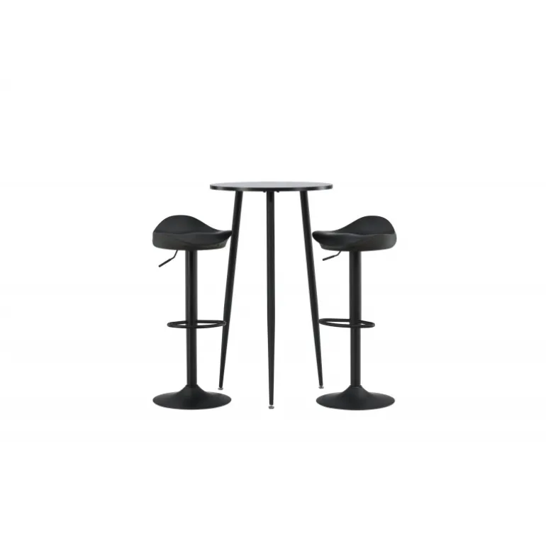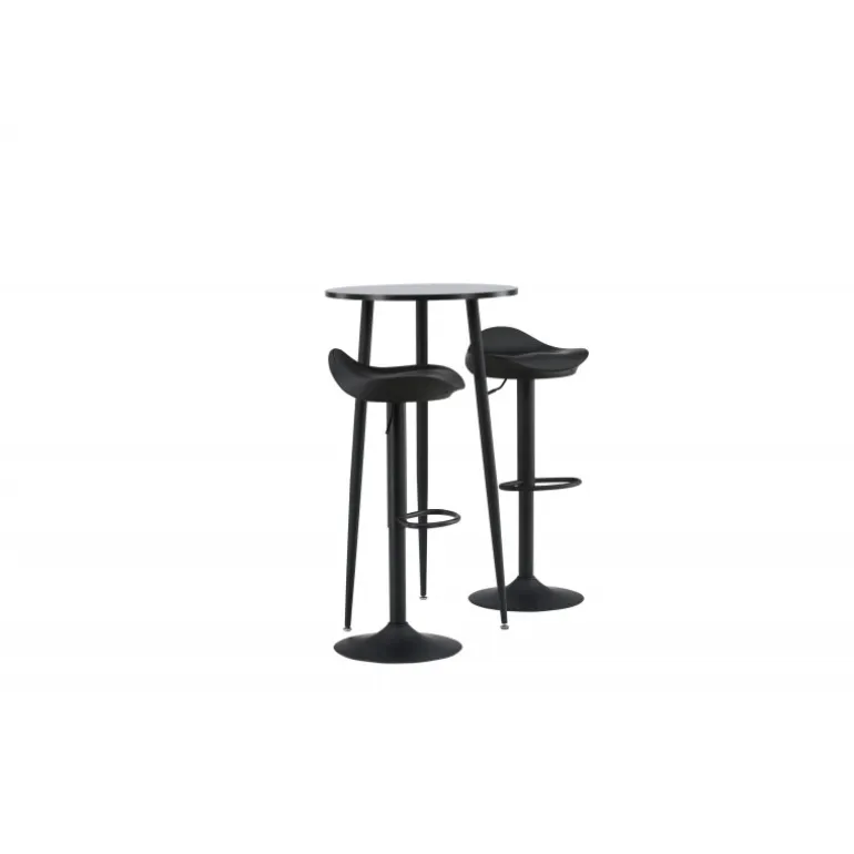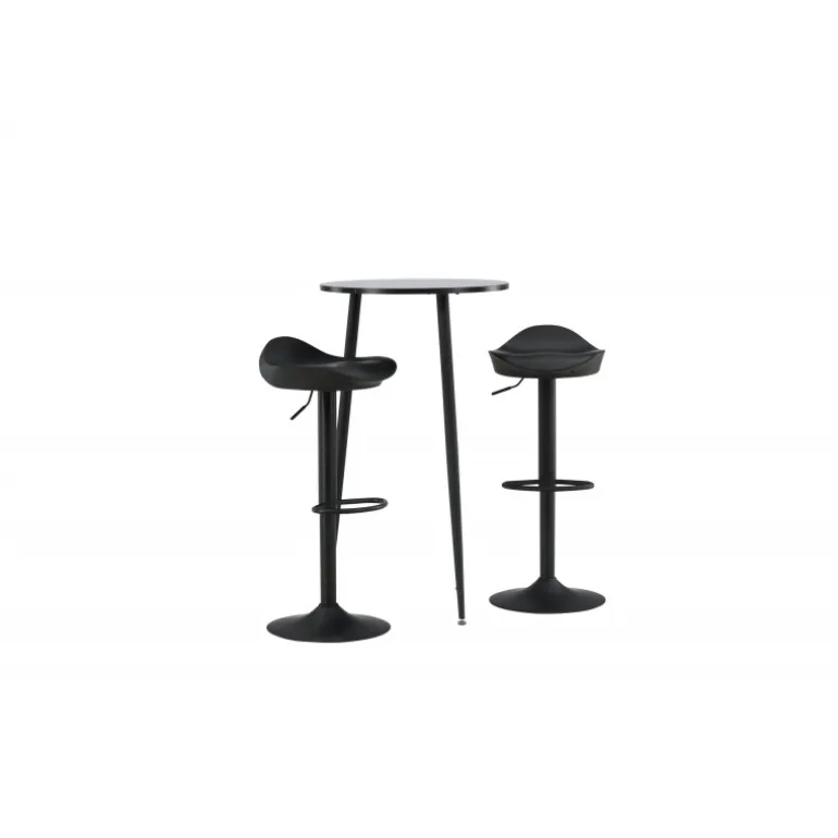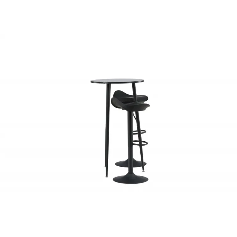 Moderne, praktisk og tidløst – et barsæt, der passer perfekt i det mindre køkken! Her kombinerer vi barstole fra Adesto-serien med vores stilfulde barbord Plaza. Barstolen har et tidløst design med en sort ståltrumpetfod og et komfortabelt sæde i sort plast. Barbordet har en rund bordplade i sort MDF og let udstående bordben i sort metal. Placer barsættet i køkkenet eller hvor der er behov for ekstra siddepladser og nyd lange, vidunderlige stunder med familie og venner!