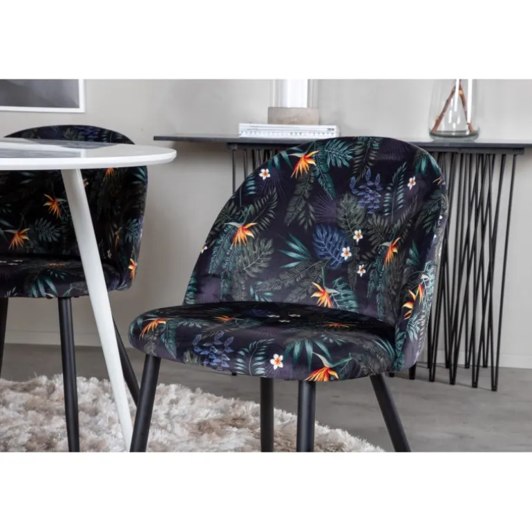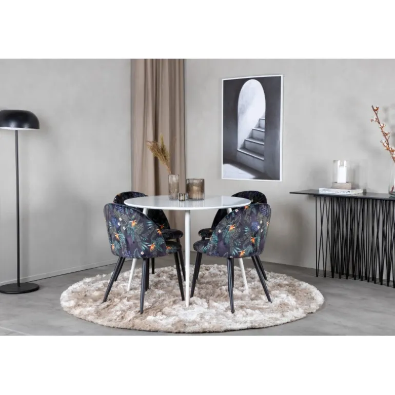 Plaza moderne og stilfuldt Spisebordssæt – her sammen med spisestole i serien Velvet. Skab noget pænt og socialt med plads til god mad og hyggeligt samvær! Dette sæt kombinerer et hvidt bord af MDF og stål med sorte stole, der giver et elegant og moderne udtryk til dit hjem. Perfekt til både hverdag og festlige lejligheder.